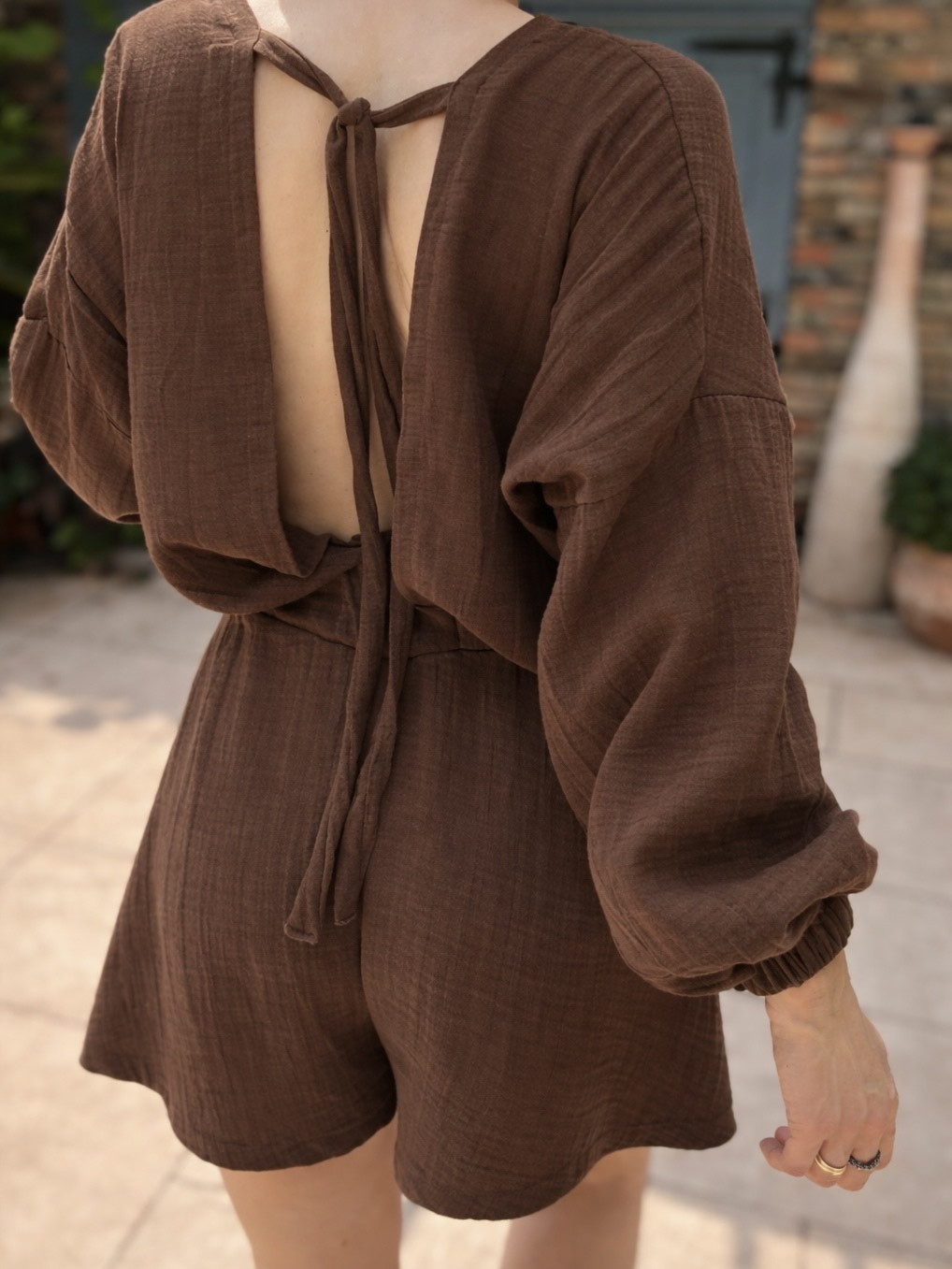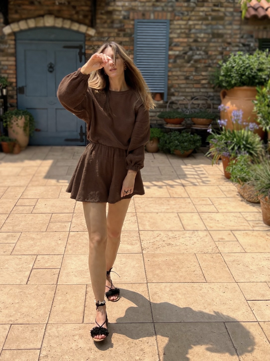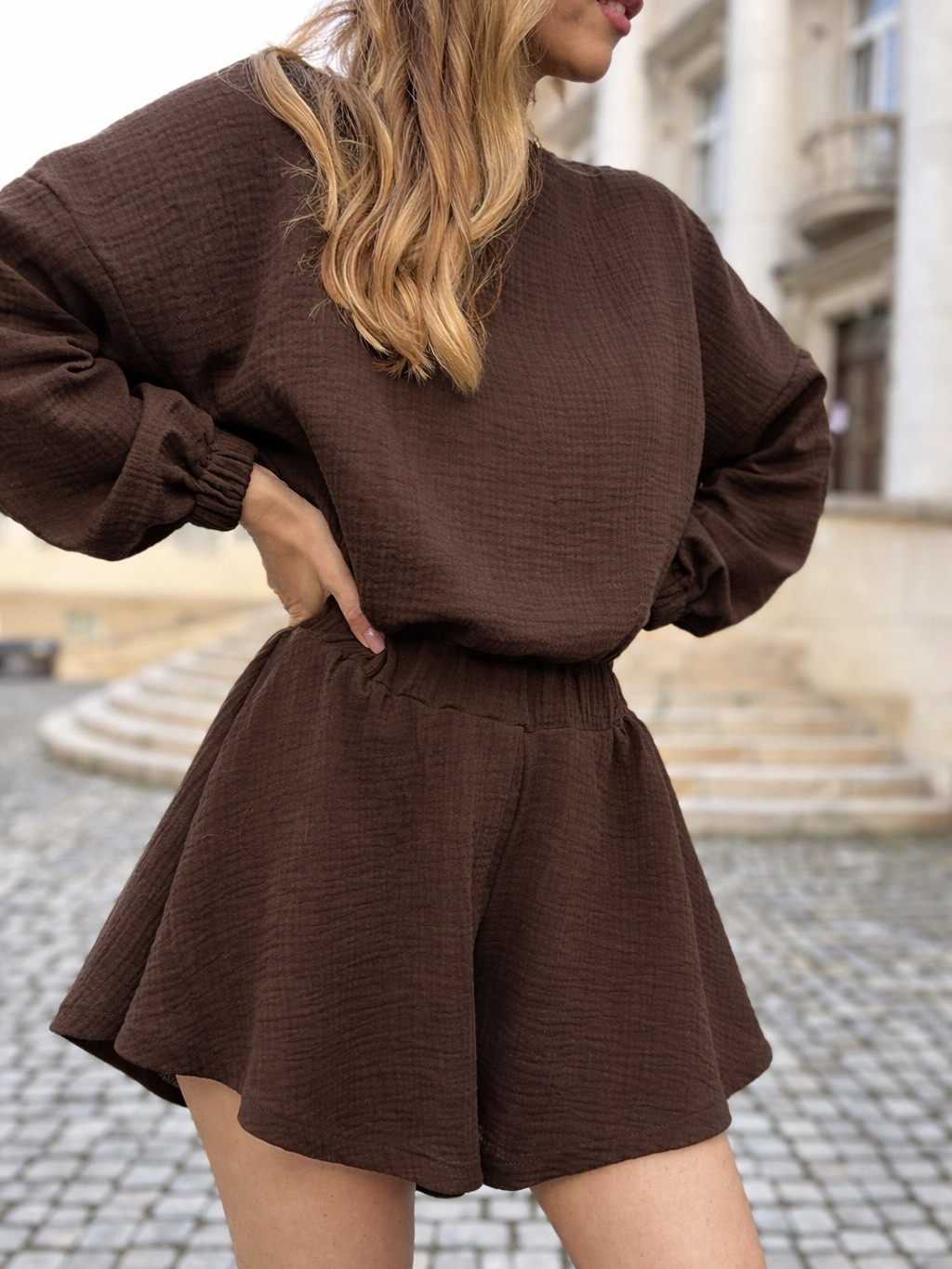 Efektowna bluzka i szerokie szorty z delikatnej, muślinowej tkaniny, unoszą się jak motyl podczas każdego ruchu, pięknie eksponując sylwetkę.