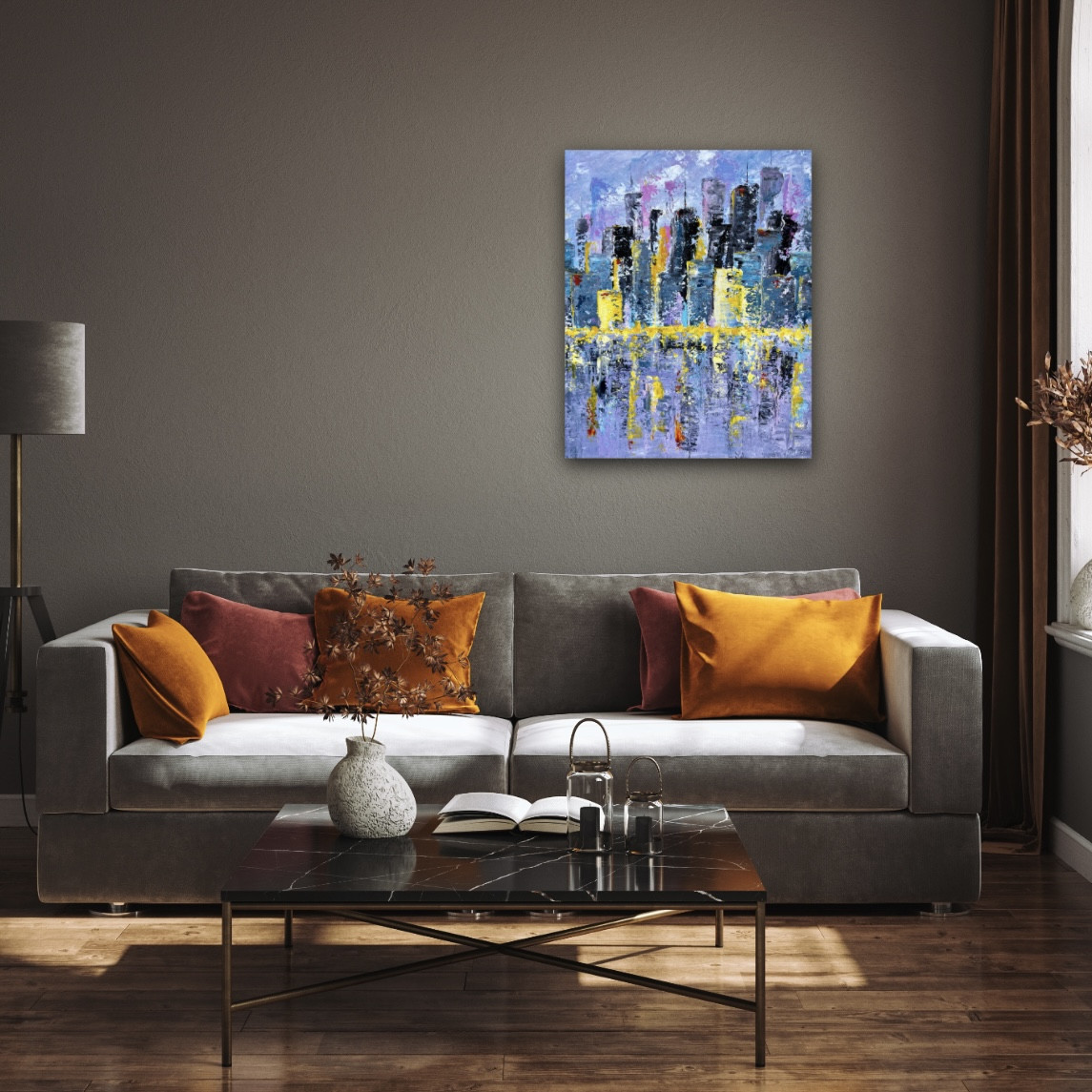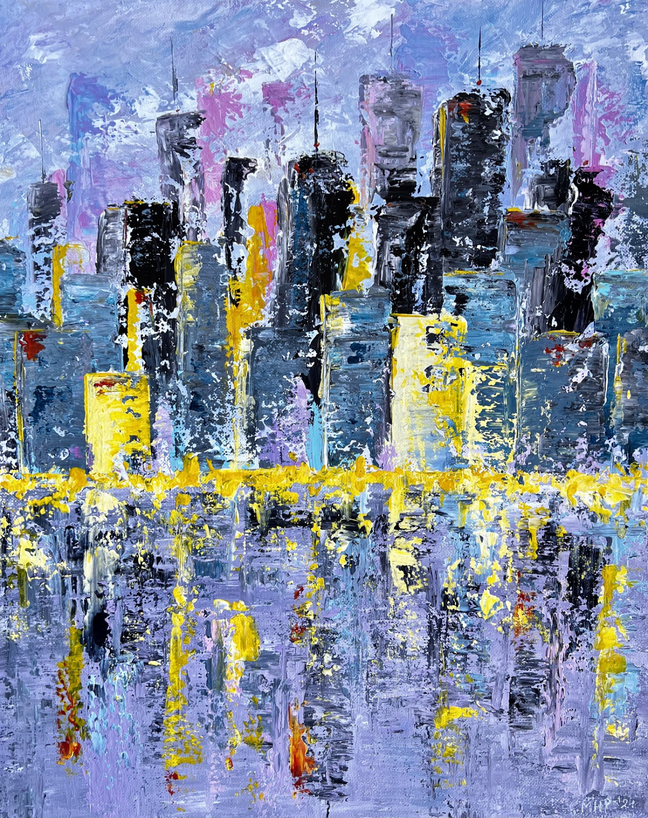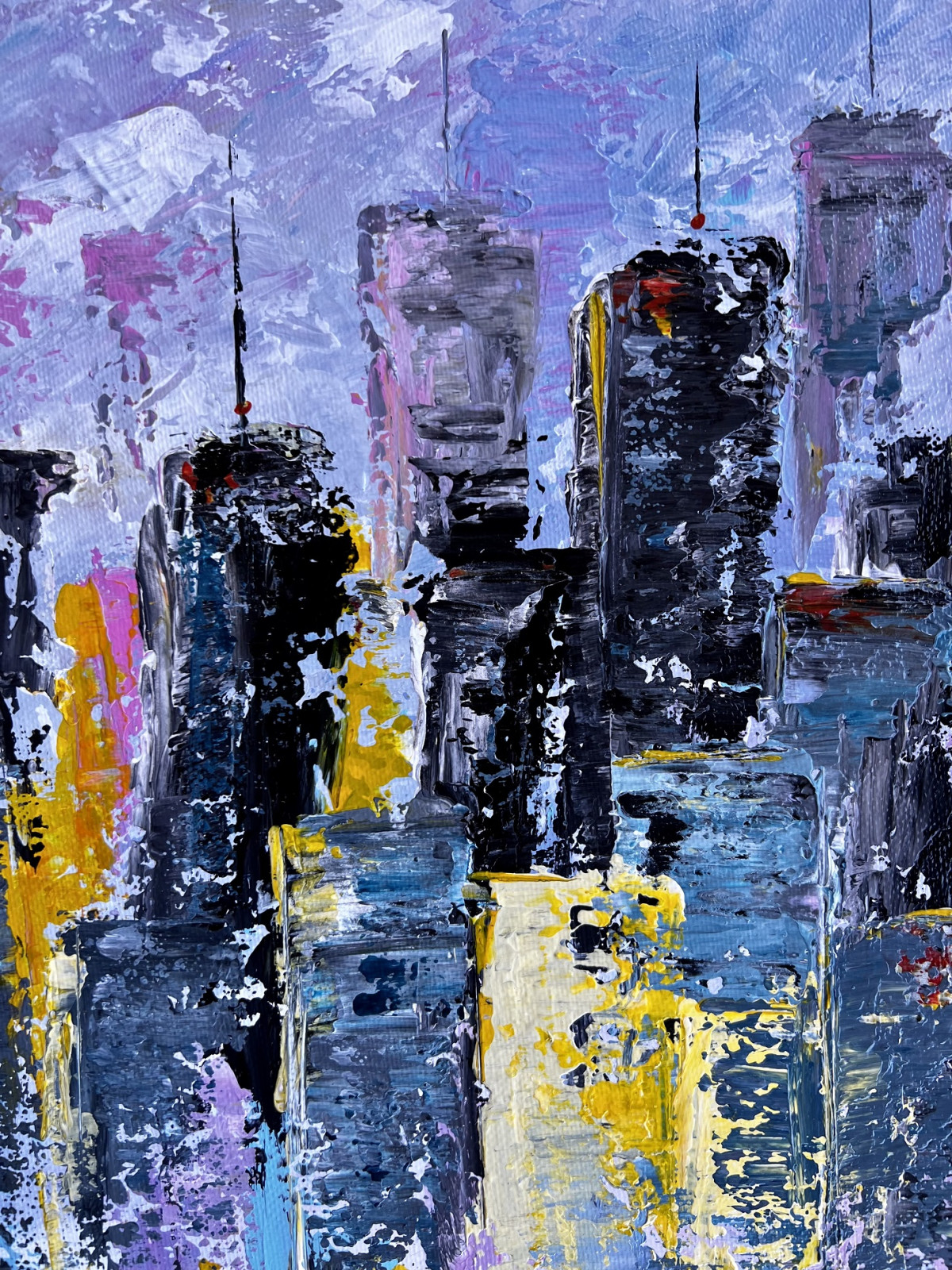 Praca New York to obraz namalowany farbami akrylowymi przy użyciu szpachli malarskich, na podobraziu o wielkości 50 x 40 cm.