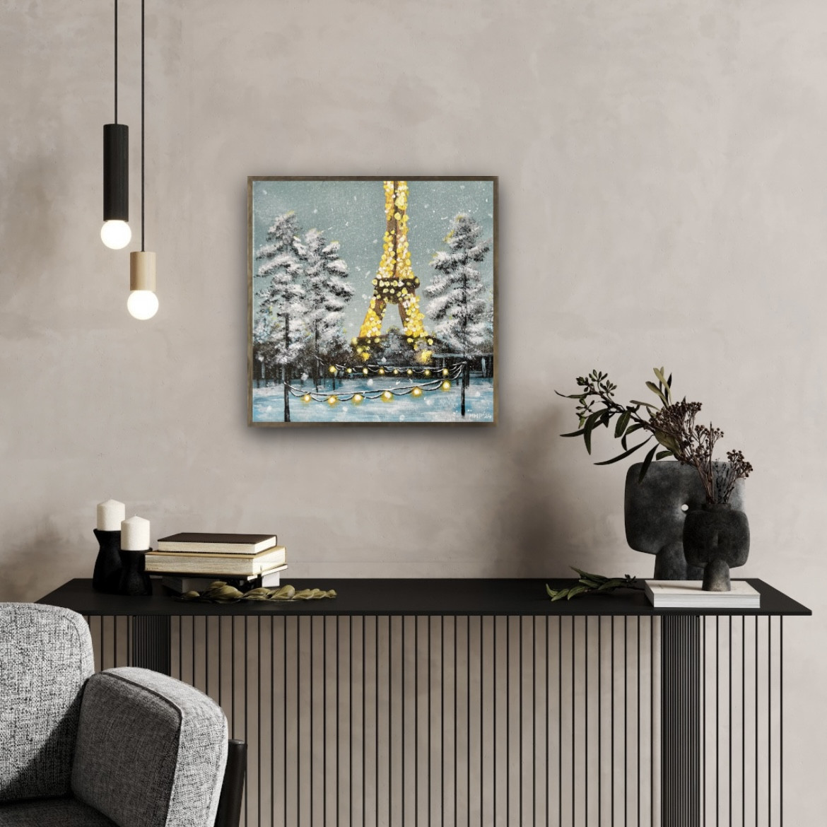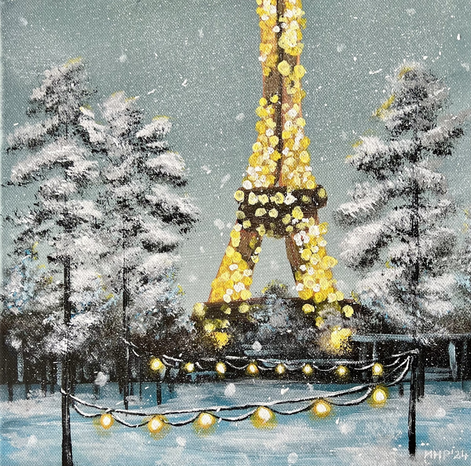 Praca inspirowana jest miastem Paryż w zimowej, śnieżnej odsłonie.