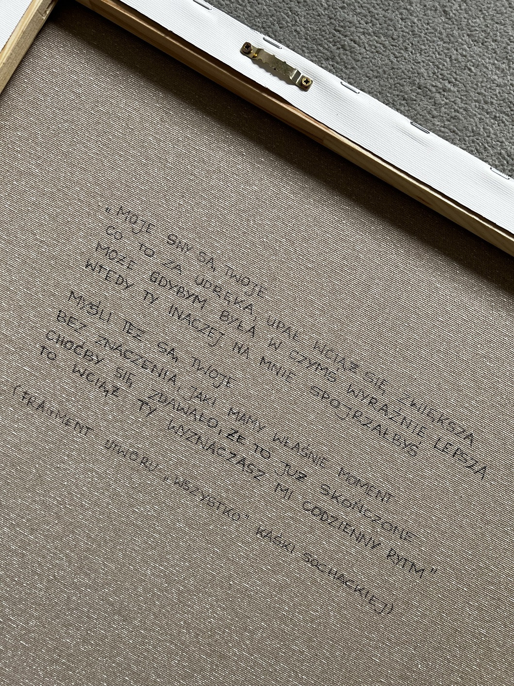 Praca pochodzi z cyklu MADISON. Namalowałam piosenki. Obraz stanowi interpretację utworu Kaśki Sochackiej Wszystko, pochodzącego z płyty Ta druga. Za zgodą Autorki kompozycji muzycznej, na rewersie płótna zawarty został fragment malowanej piosenki.