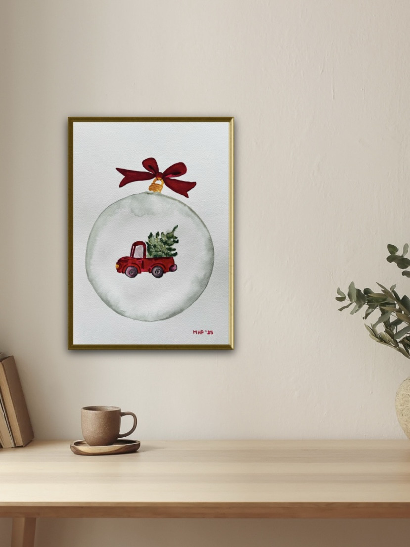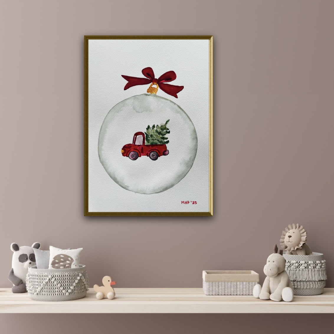 Bombka z autkiem to oryginalna akwarela namalowana na profesjonalnym papierze akwarelowym 300g. Format a4. Praca jest sygnowana z przodu oraz podpisana z tyłu.