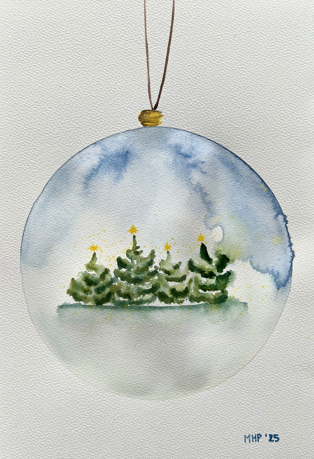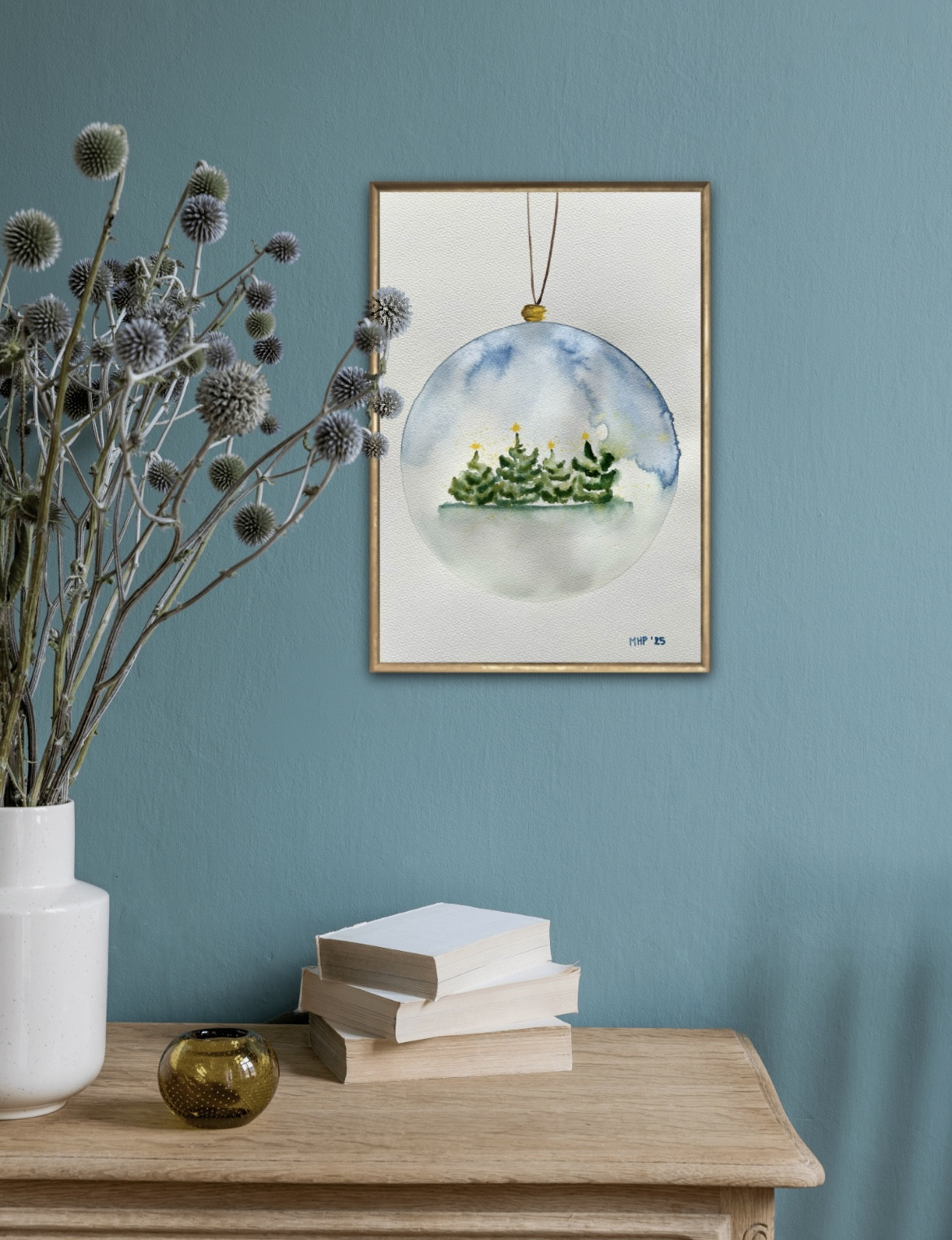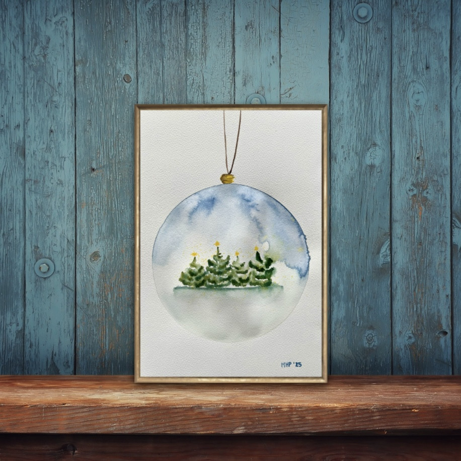 Bombka z choinkami to oryginalna akwarela namalowana na profesjonalnym papierze akwarelowym 300g. Format a4. Praca jest sygnowana z przodu oraz podpisana z tyłu.