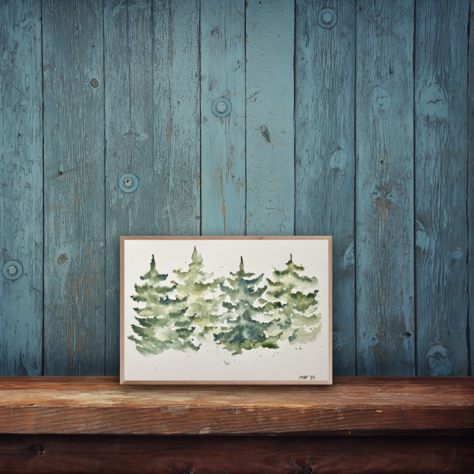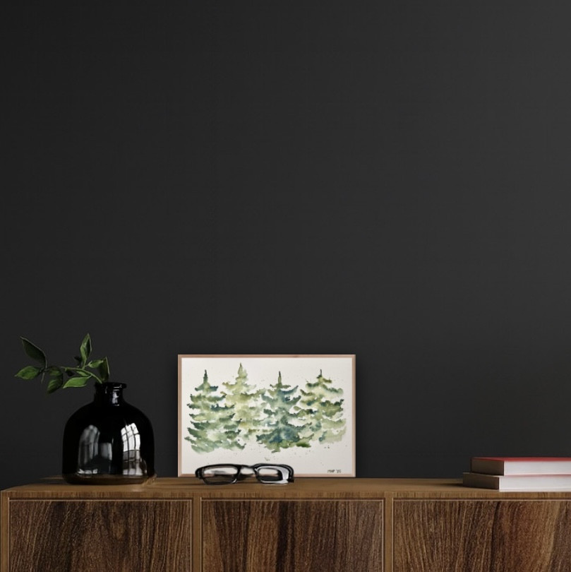 Choinki to oryginalna akwarela namalowana na profesjonalnym papierze akwarelowym 300g. Format a4. Praca jest sygnowana z przodu oraz podpisana z tyłu.