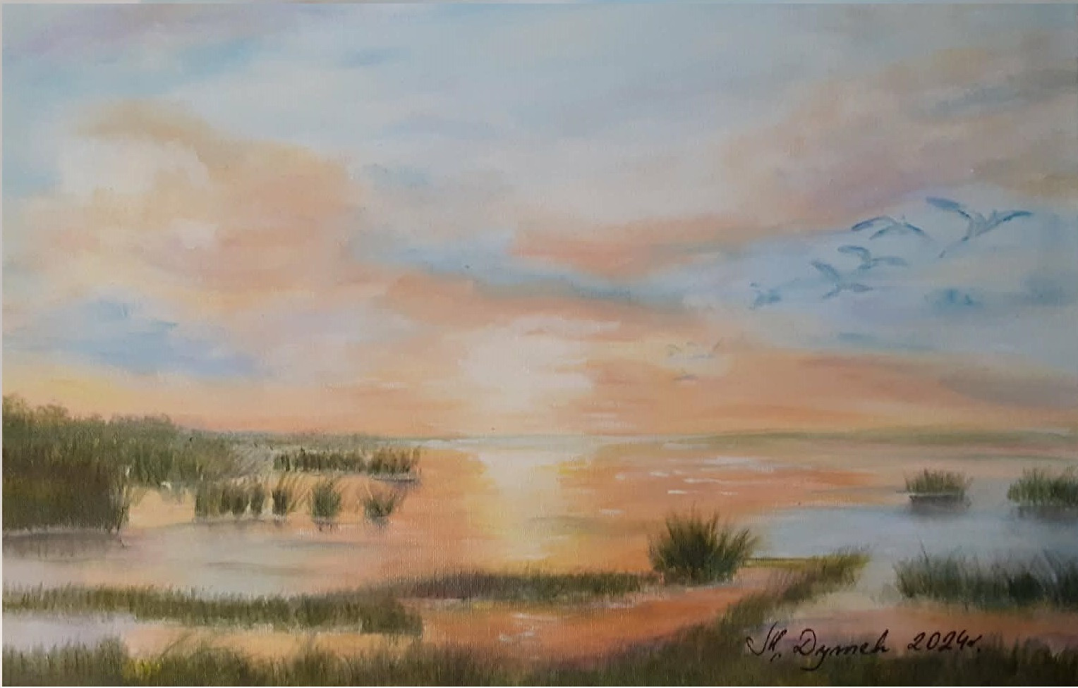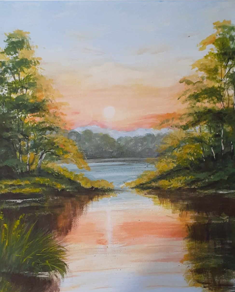 - Tematyka: Polski krajobraz z motywem wody i nieba. Brzeg spokojnego jeziora o zachodzie słońca emanuje ciszą i nostalgią