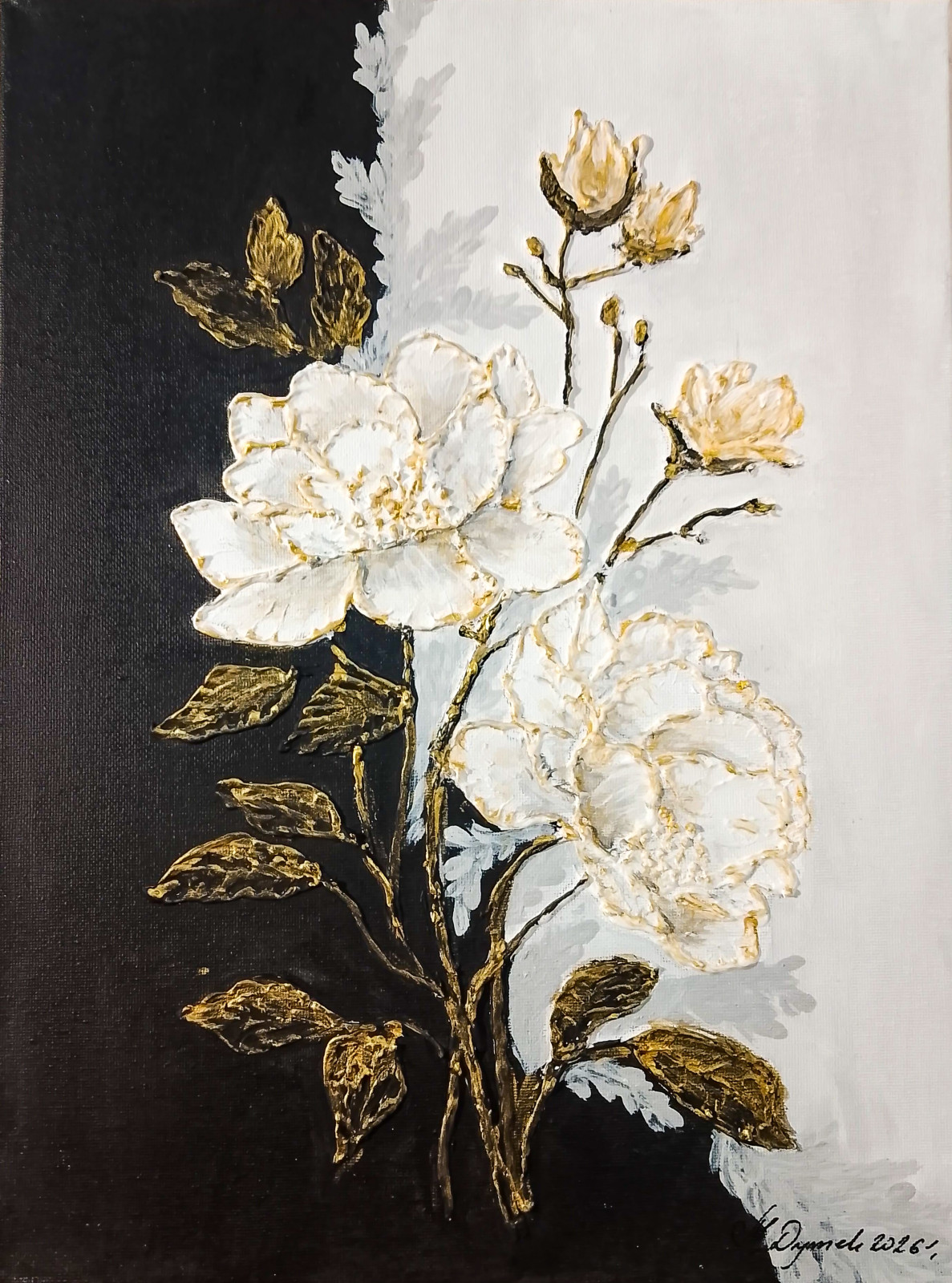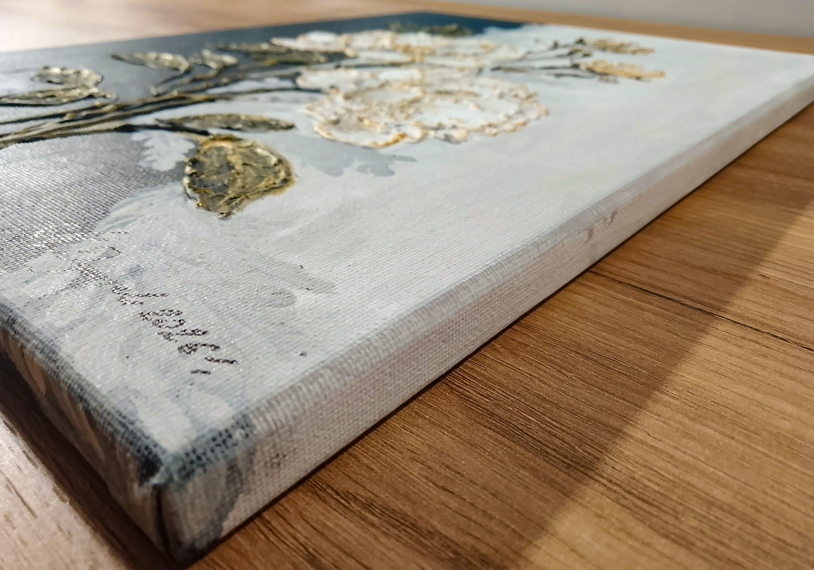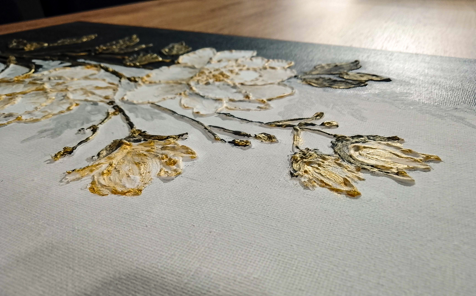 Dopełnij swoje wnętrze nutą luksusu - unikatowy, ręcznie malowany obraz o motywie florystycznym, który łączy w sobie klasyczną elegancję bieli z luksusowym blaskiem złota. Totalna nowość w naszej galerii! Obraz strukturalny (impasto) nadający kwiatom trójwymiarowy efekt i sprawia, że obraz żyje i mieni się w zależności od oświetlenia.