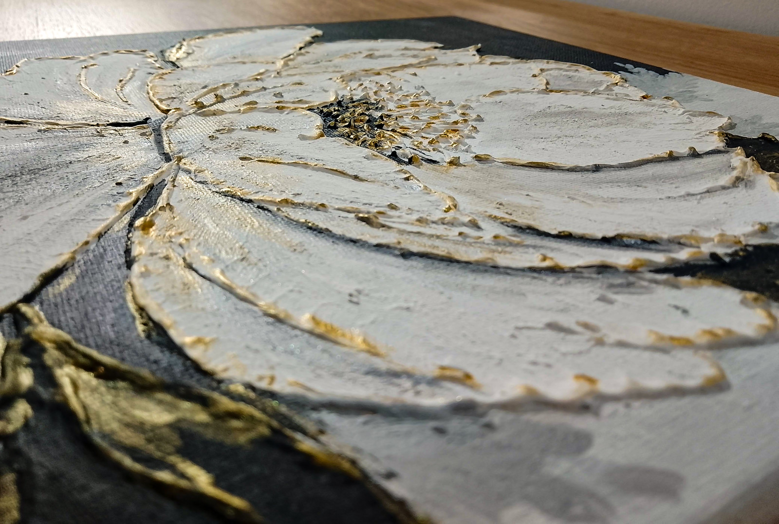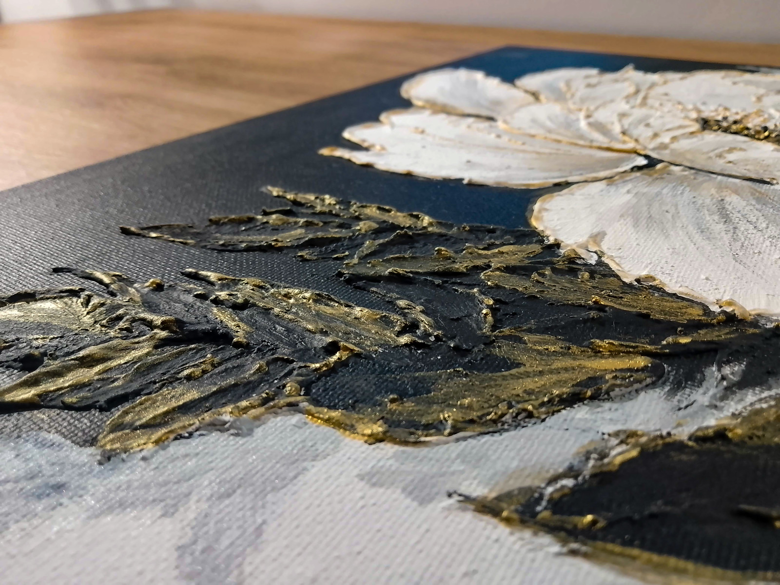 Dopełnij swoje wnętrze nutą luksusu - unikatowy, ręcznie malowany obraz przedstawiający monumentalny biały kwiat na ciekawie kontrastującym ciemnym tle. Totalna nowość w naszej galerii! Obraz strukturalny, łączący w sobie nowoczesną formę z głęboką teksturą 3D oraz pieczołowicie nakładanymi złoceniami, które pięknie mienią się w zależności od kąta padania światła.