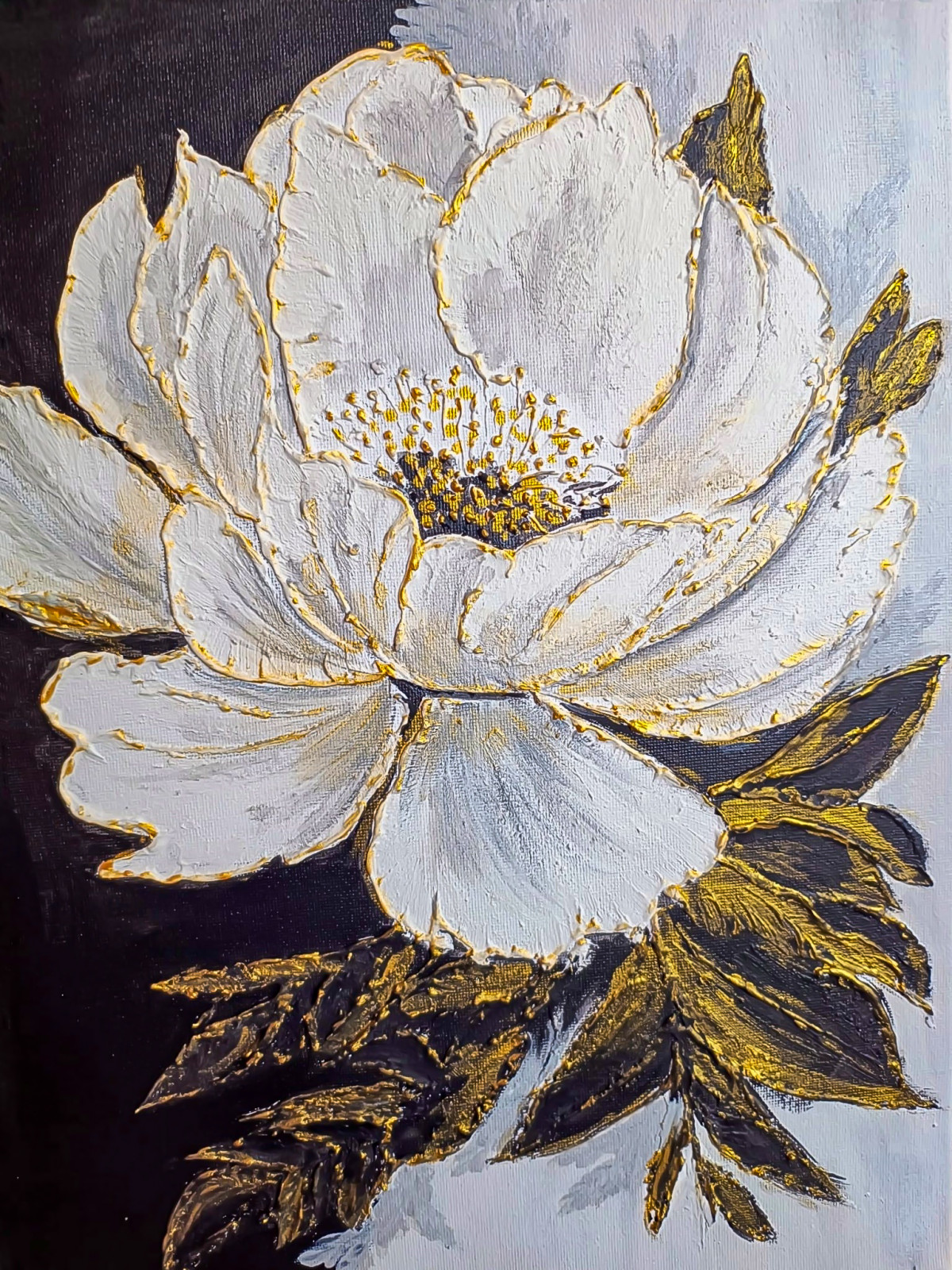 Dopełnij swoje wnętrze nutą luksusu - unikatowy, ręcznie malowany obraz przedstawiający monumentalny biały kwiat na ciekawie kontrastującym ciemnym tle. Totalna nowość w naszej galerii! Obraz strukturalny, łączący w sobie nowoczesną formę z głęboką teksturą 3D oraz pieczołowicie nakładanymi złoceniami, które pięknie mienią się w zależności od kąta padania światła.