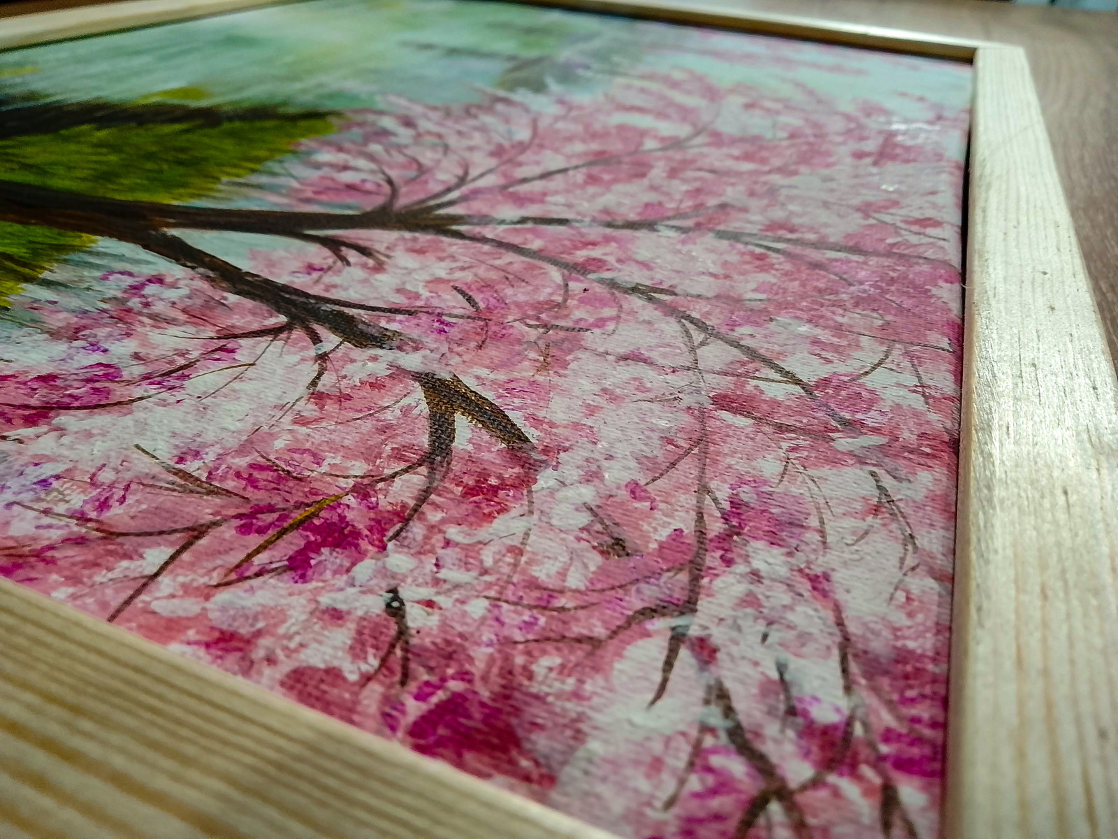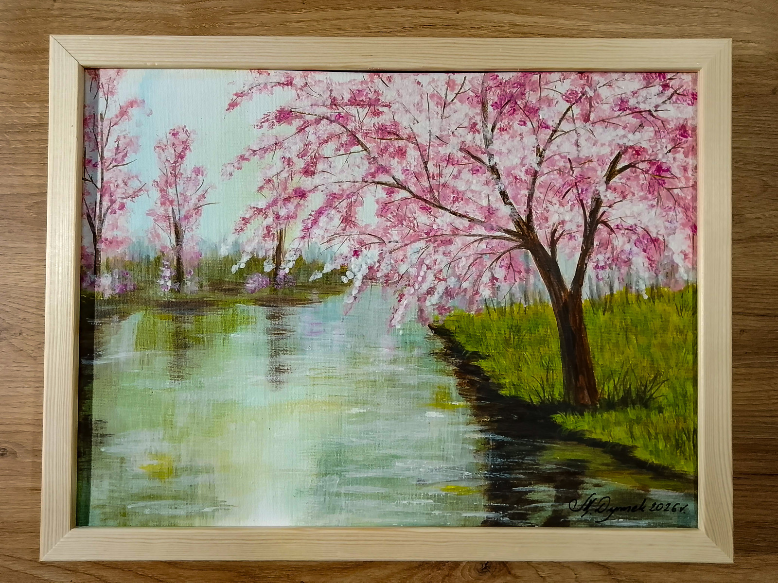 - Tematyka: Niepowtarzalny pejzaż - kwitnąca sakura malowniczo pochylona nad taflą wody