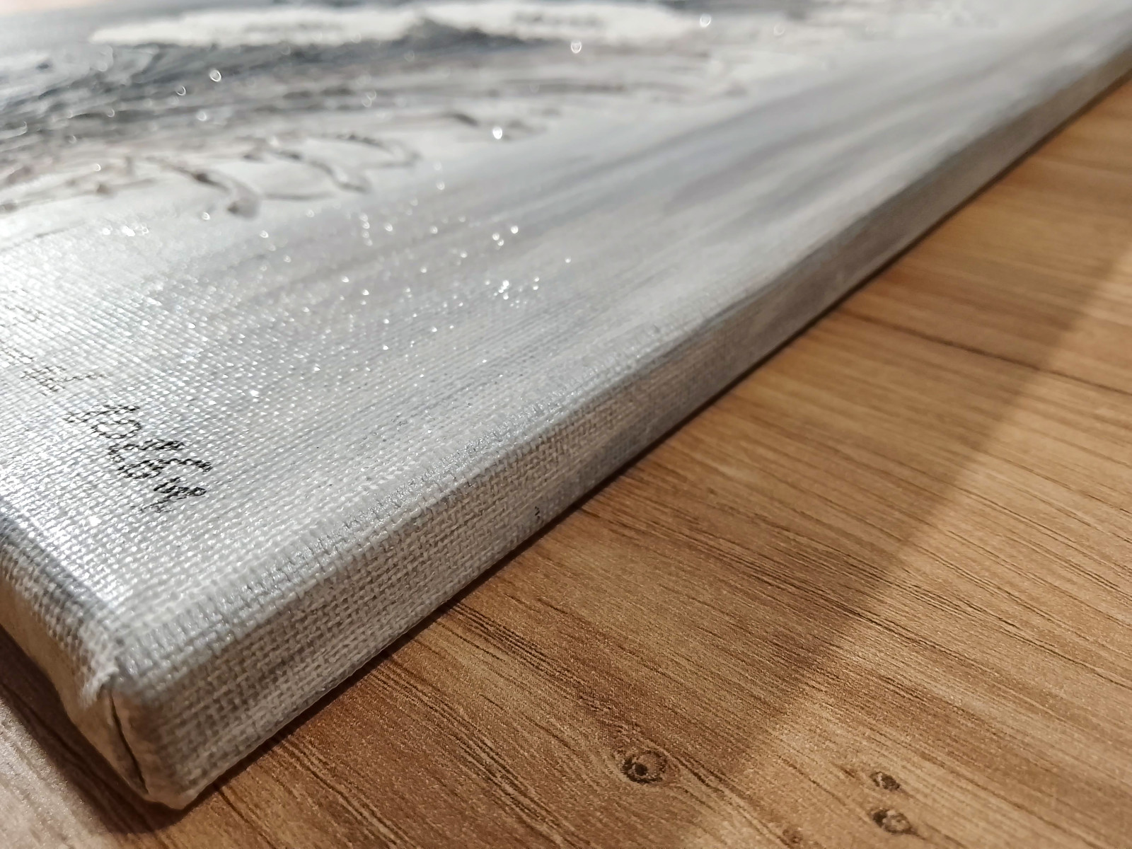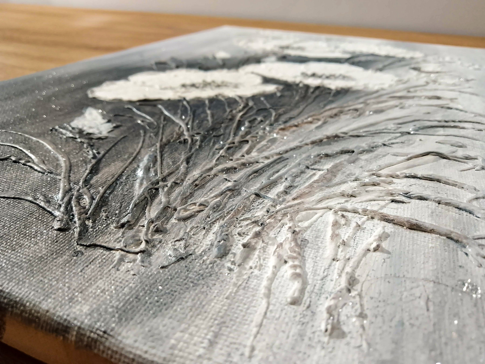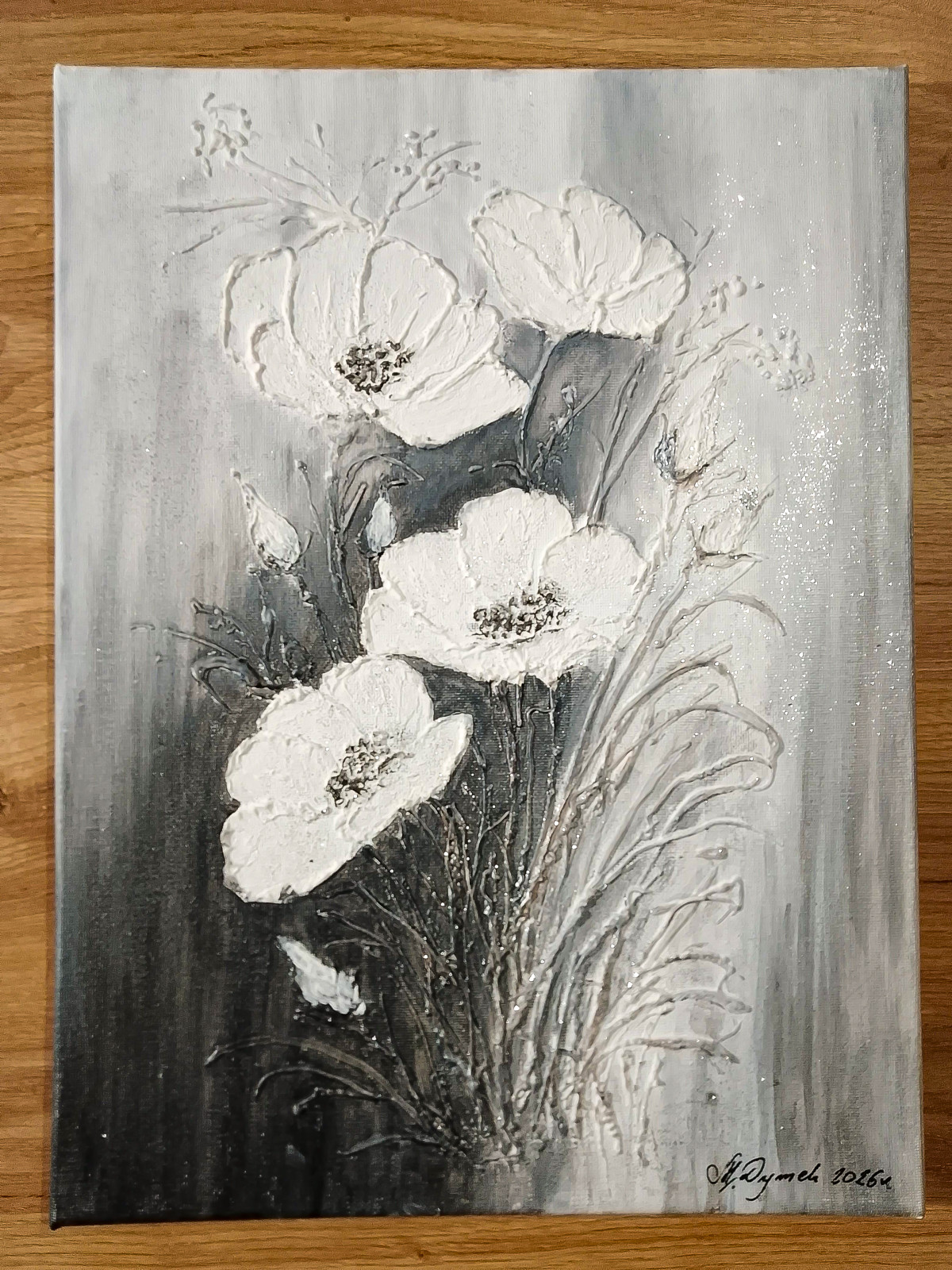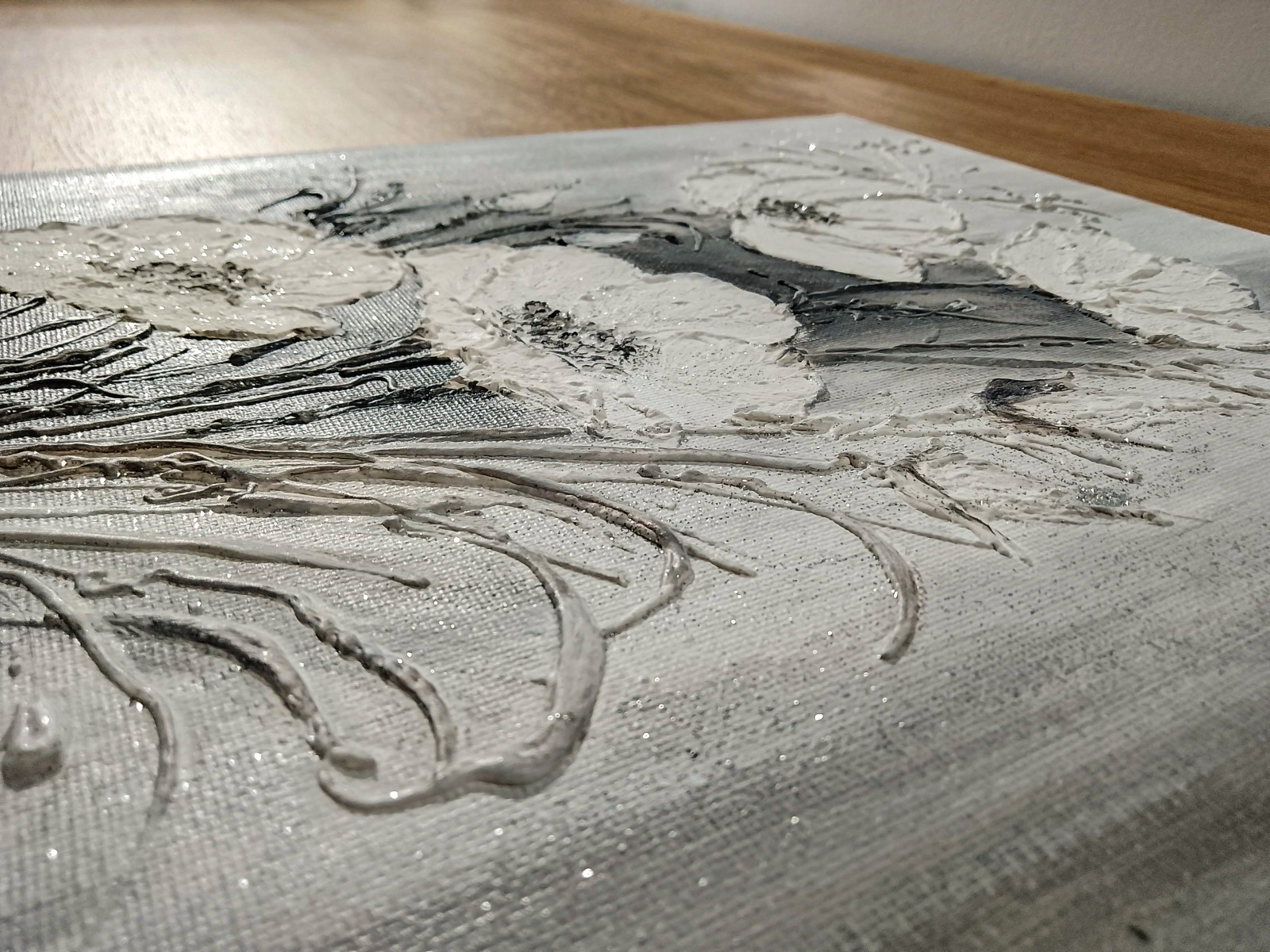 Obraz strukturalny, łączący w sobie nowoczesną formę z głęboką teksturą 3D dopełni wnętrze nutą luksusu dodając klasy i nowoczesnego blasku. Wyjątkowa kompozycja florystyczna w stylu ombre, w której surowość szarości spotyka się z nieskazitelną bielą w subtelnie srebrzystym wykończeniu. Kwiaty zostały naniesione grubą warstwą pasty strukturalnej, dzięki czemu dosłownie wychodzą z płótna, co daje efekt niesamowitej głębi. Obraz pięknie pracuje ze światłem, zmieniając swój wygląd w zależności od pory dnia. Praca została stworzona z myślą o wnętrzach, w których sztuka ma być nie tylko dekoracją, ale i namacalnym doświadczeniem. Każdy egzemplarz jest niepowtarzalny i jedyny w swoim rodzaju. Nie jest to wydruk, lecz autorskie dzieło z wyraźnym śladem ręki artysty.