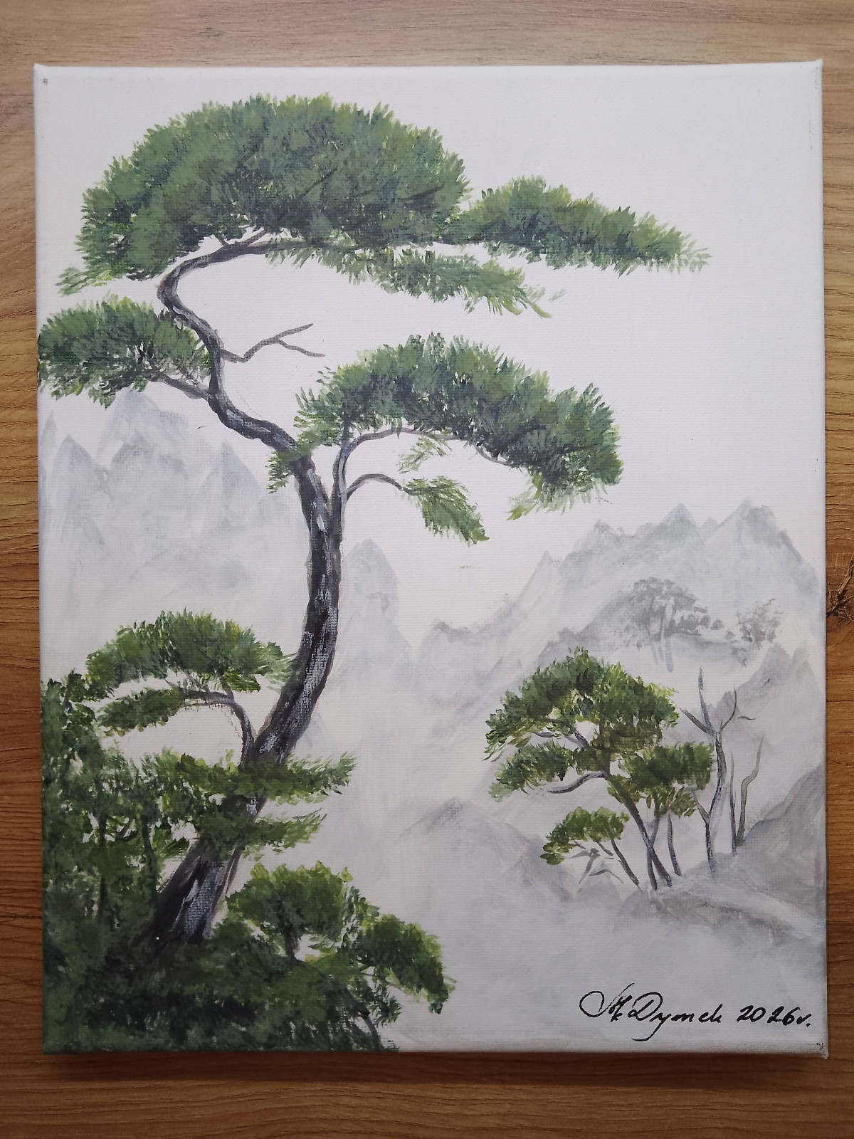 - Tematyka: Malowniczy pejzaż inspirowany estetyką orientu. Przedstawia wiekowe sosny na tle zamglonych monumentalnych gór. Kompozycja symbolizująca trwałość, siłę i spokój ducha
