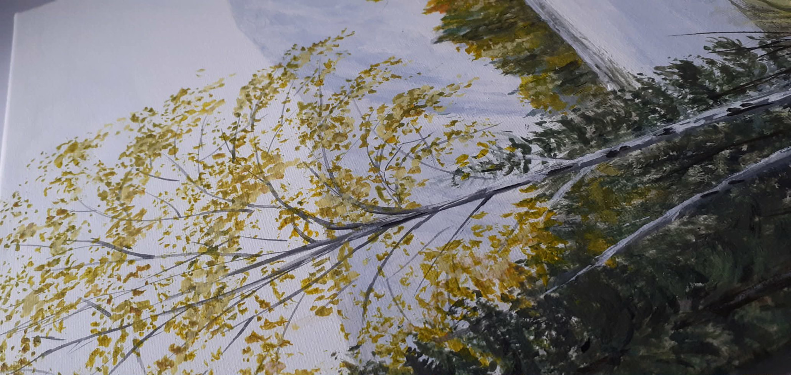 - Tematyka: Polski krajobraz, rzeka w otoczeniu gęstego las, centralny punkt kompozycji stanowi pojedyncza, smukła brzoza o złocistych, jesiennych liściach