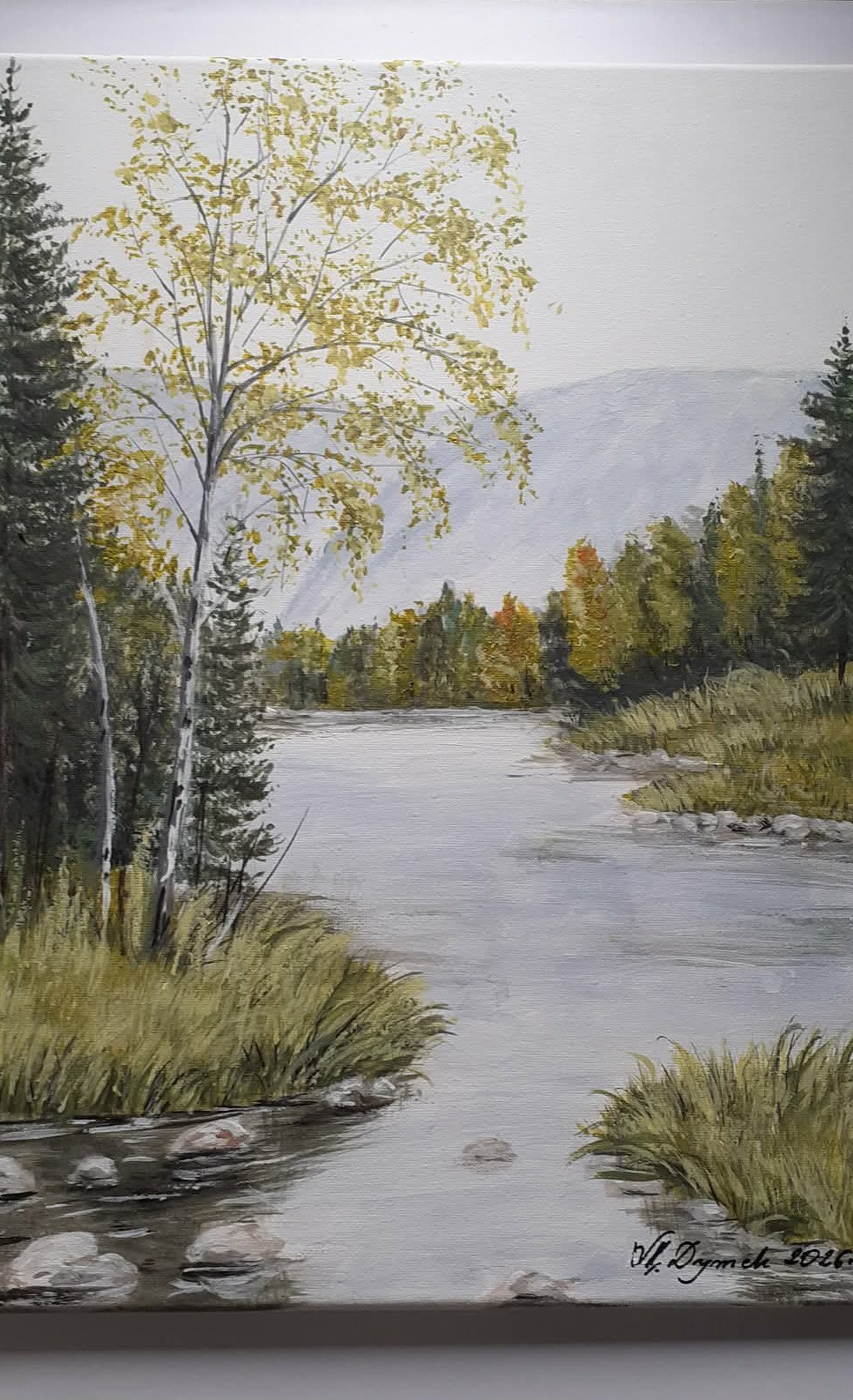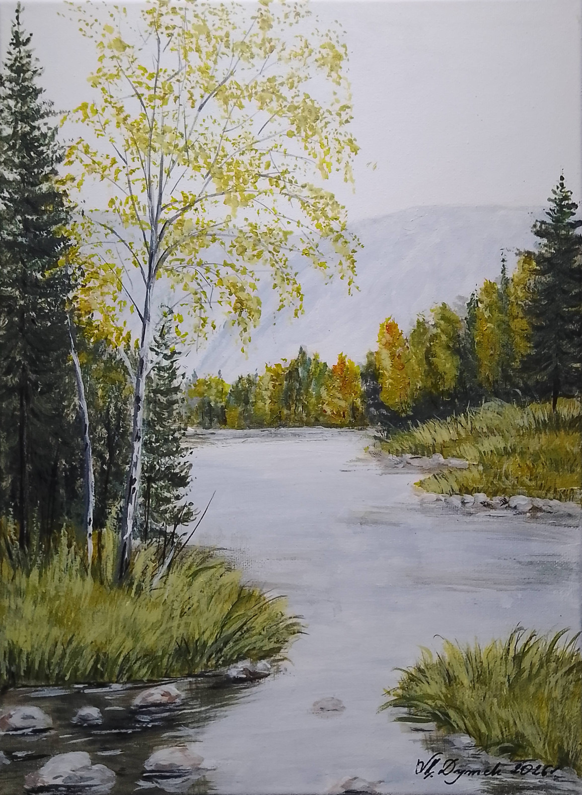 Nastrojowy jesienny pejzaż przedstawiający spokojny nurt rzeki otoczony lasem, a centralny punkt stanowi świetlista brzoza o złocistych liściach. Subtelna gra świateł oraz chłodna błękitna mgła w tle, nadają kompozycji głębi i wprowadzają do wnętrza atmosferę spokoju oraz harmonii. Przepięknie udekoruje ściany salonu, sypialni, czy gabinetu. Idealny również jako prezent na każdą okazję dla miłośników natury i polskiego krajobrazu.