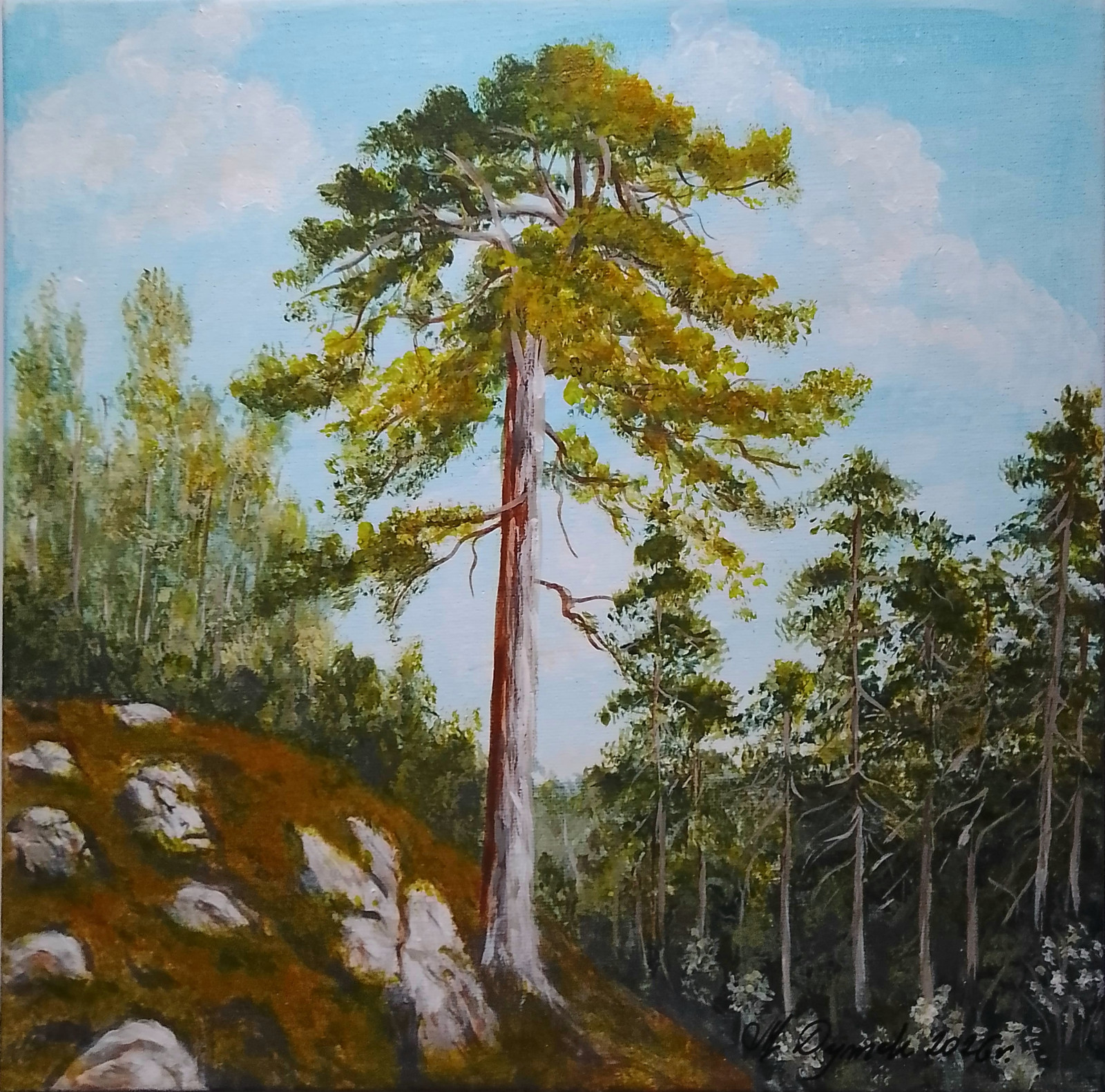 Piękne, nastrojowe dzieło, przedstawiające majestatyczną sosnę na skalistym zboczu. Łączy w sobie surowość natury z ciepłem słonecznego dnia, wprowadzając do pomieszczenia harmonię i oddech. Gra świateł na koronie drzewa i pniu nadaje kompozycji głębi i trójwymiarowości. Dominacja zieleni i błękitu działa relaksująco, czyniąc go idealnym wyborem do każdego wnętrza. Pięknie wypełni oraz udekoruje ściany salonu, sypialni, czy gabinetu dodając wnętrzom intrygującej elegancji.