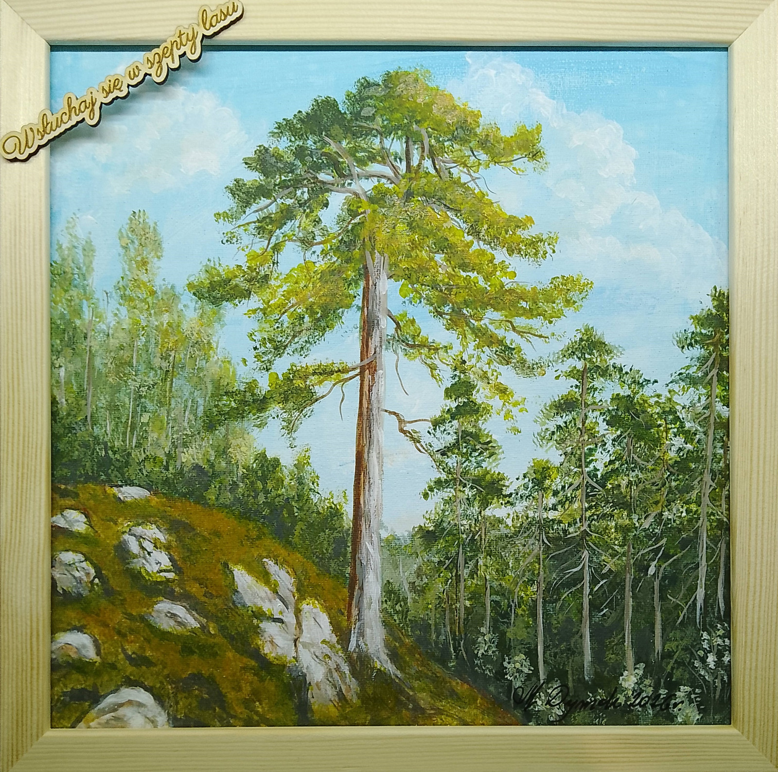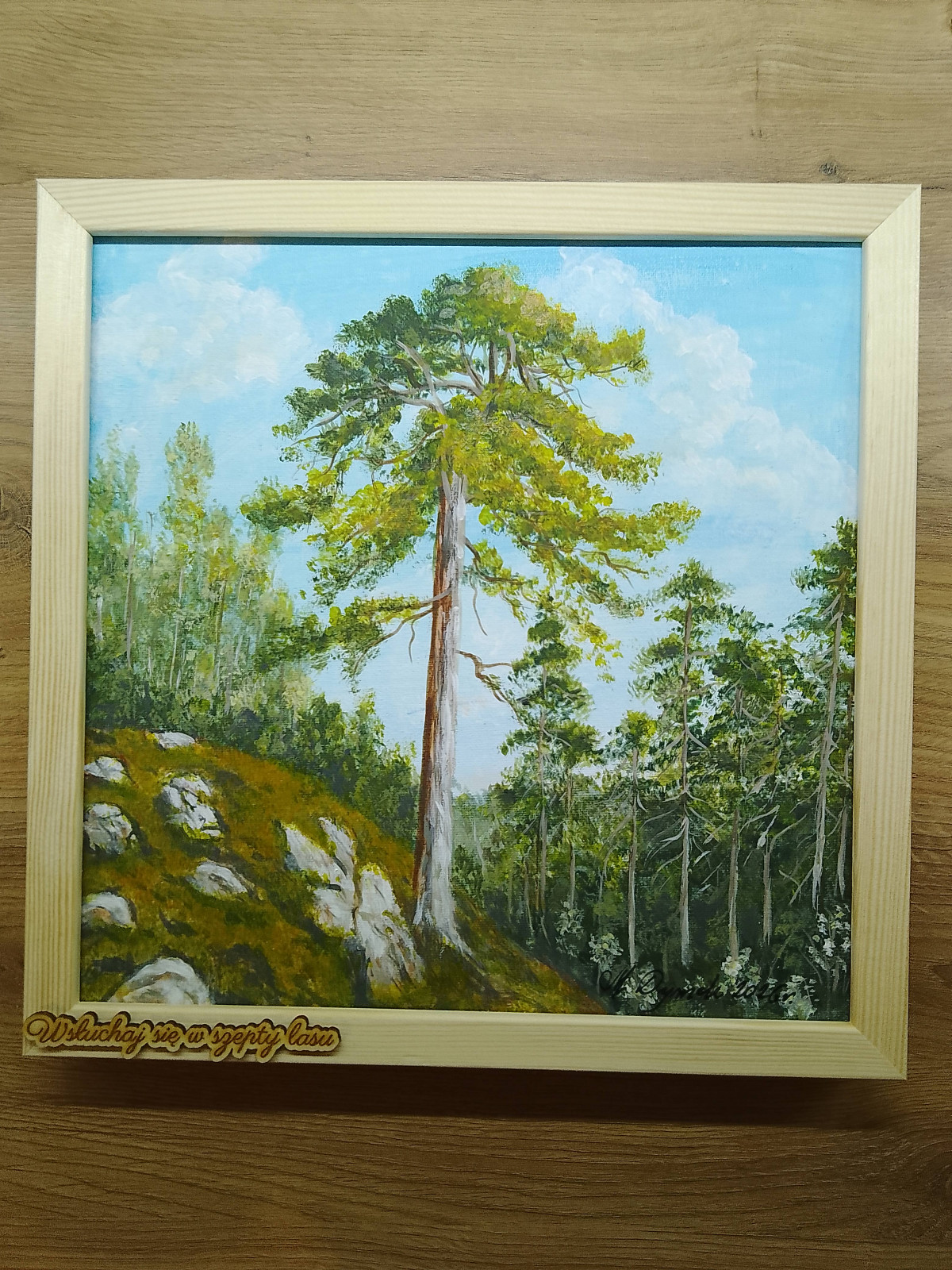 RĘCZNIE MALOWANY AKRYLOWY OBRAZ Z RAMĄ I CYTATEM - PRZENIEŚ DO WNĘTRZ ZAPACH LASU