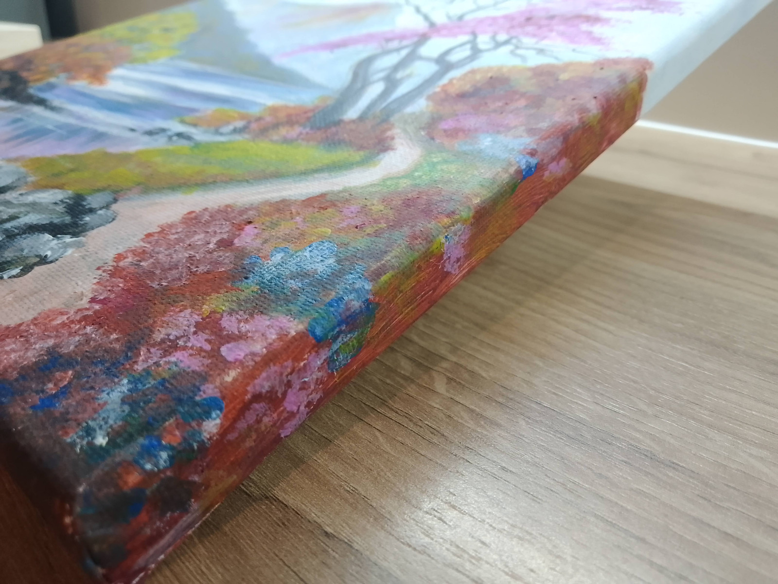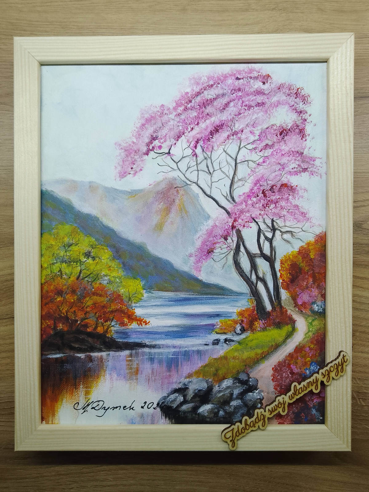 Jeden niepowtarzalny obraz - TANIEC Z BARW - malowniczy pejzaż z kwitnącym różowym drzewem nad brzegiem jeziora.