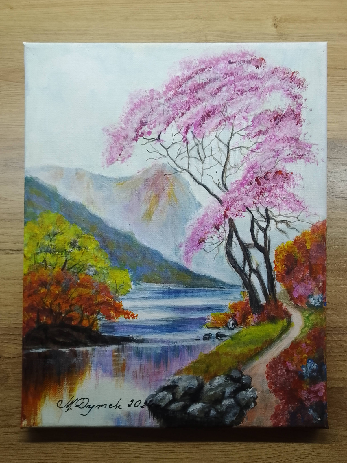 - Tematyka: Pejzaż górski, jezioro, kwitnące drzewo