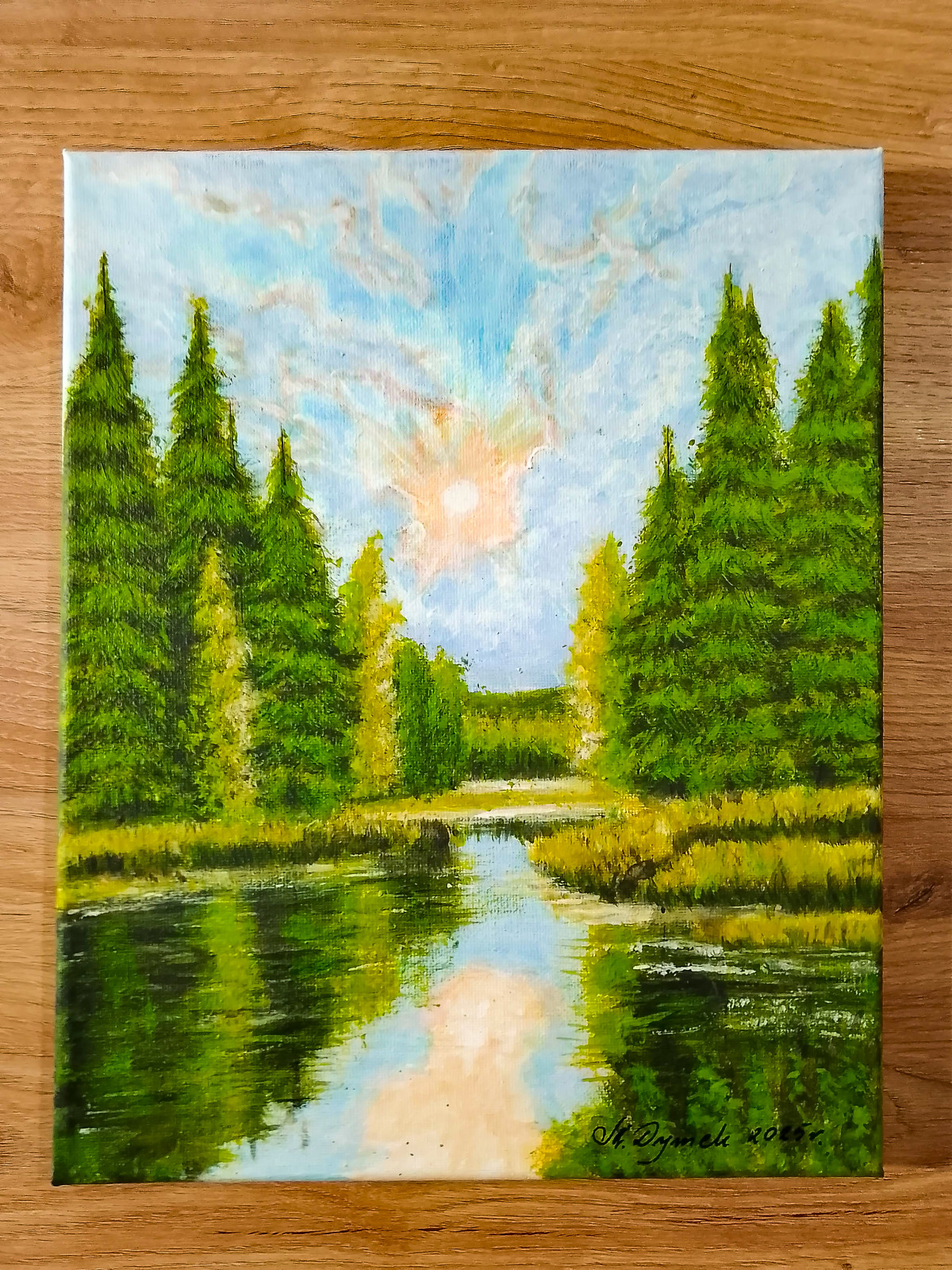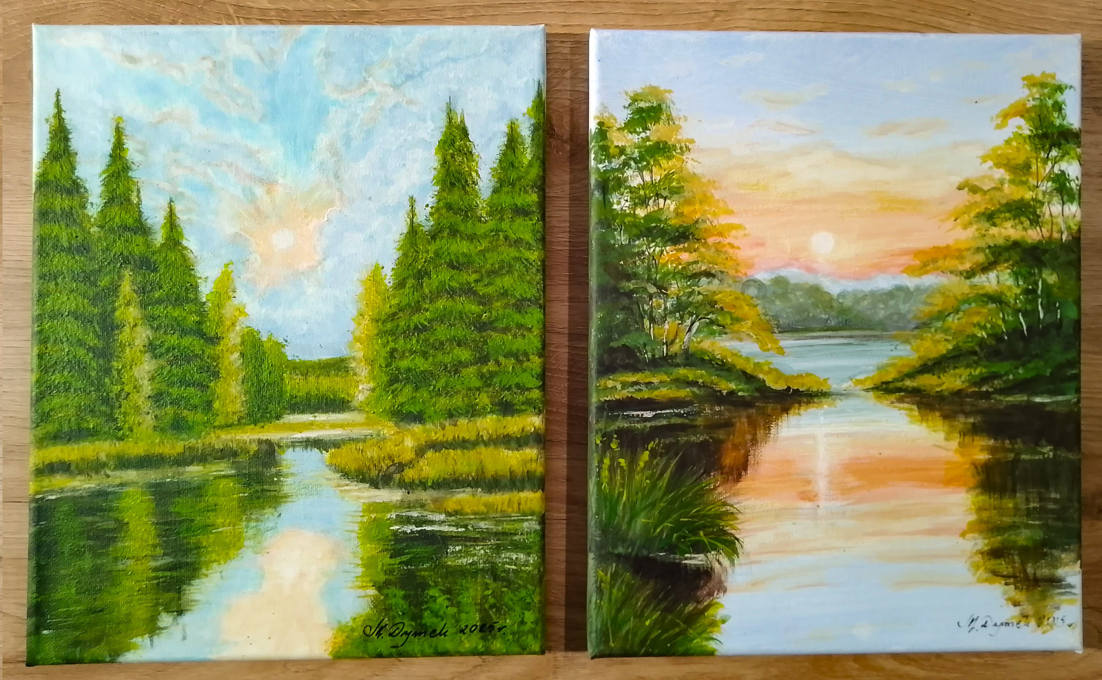 Unikatowy zestaw dwóch ręcznie malowanych obrazów, które stanowią harmonijną opowieść o świetle i naturze. Dyptyk ukazuje dwa różne oblicza leśnego jeziora: