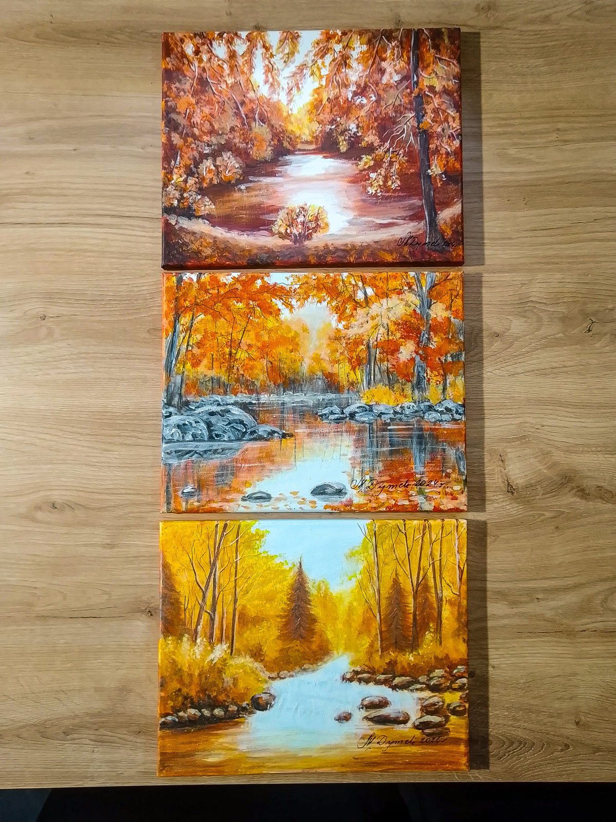 Unikalny zestaw trzech obrazów akrylowych, które wspólnie tworzą harmonijną dekorację ścienną. To intymna podróż w głąb polskiej złotej jesieni. Każde z płócien stanowi osobny rozdział opowieści o przemijaniu i niezwykłym świetle, które towarzyszy tej porze roku.