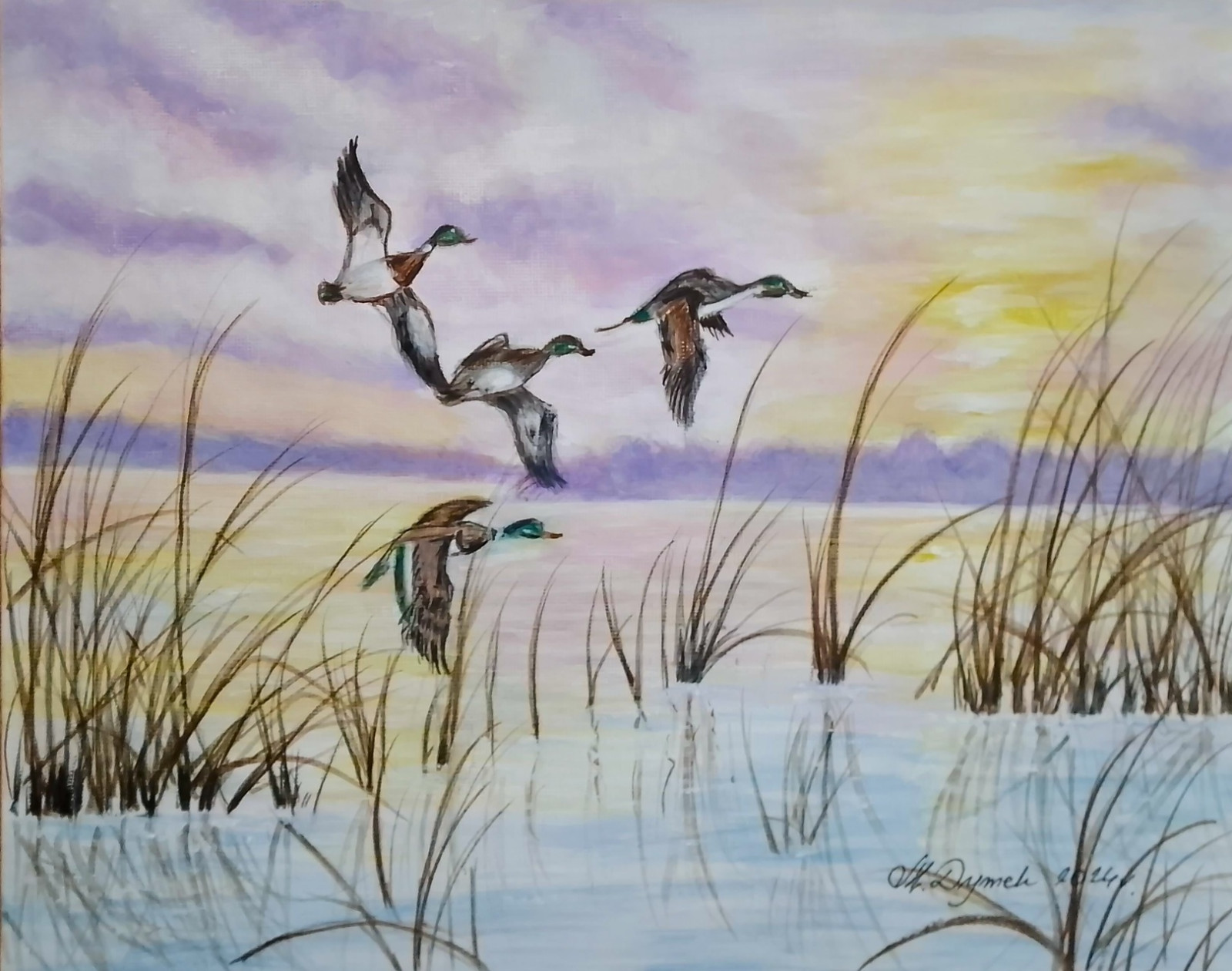 -Tematyka: Dzikie kaczki zrywające się do lotu i morskie fale rozbijające się w świetle zachodzącego słońca