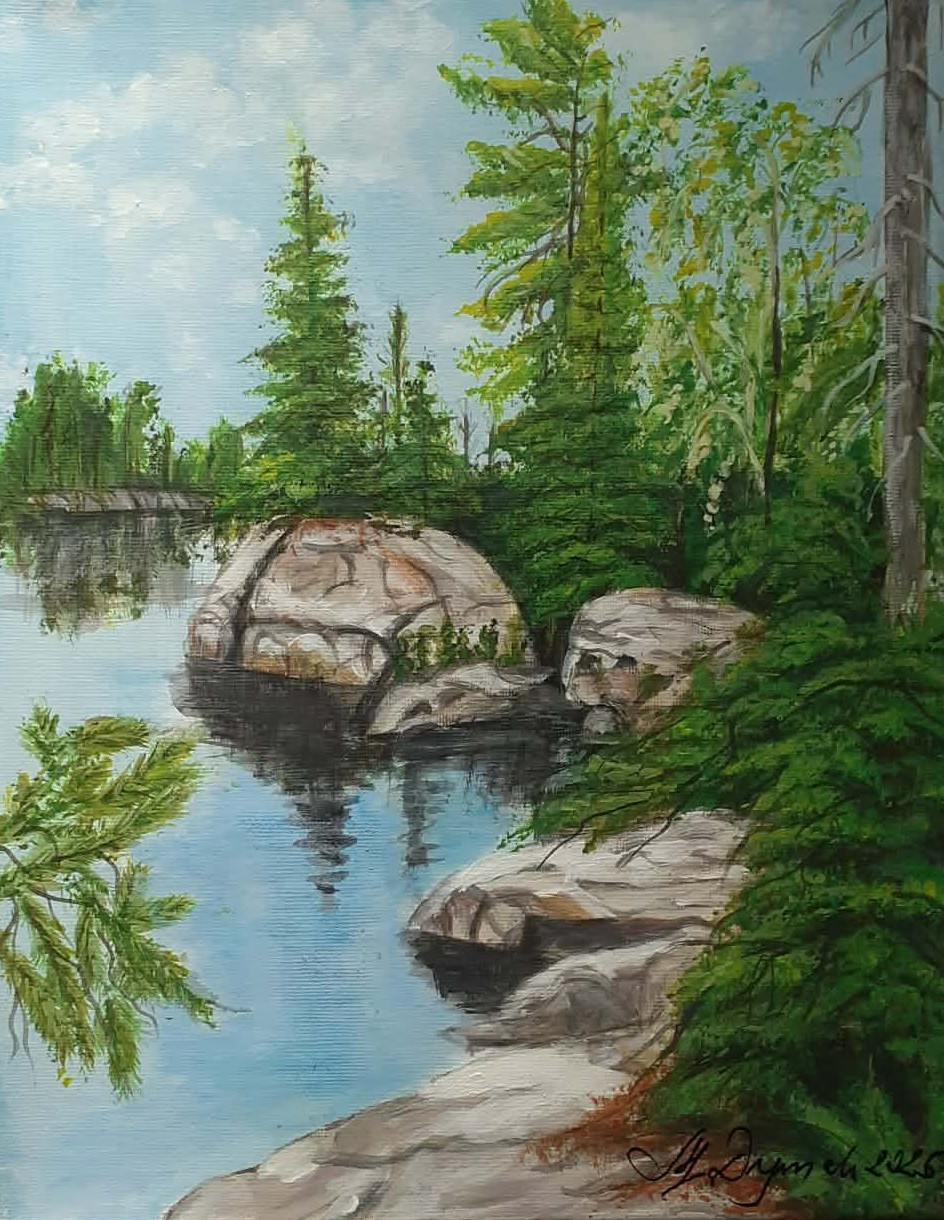 - Tematyka: Polski krajobraz, kamienne brzegi, drzewa, woda i niebo
