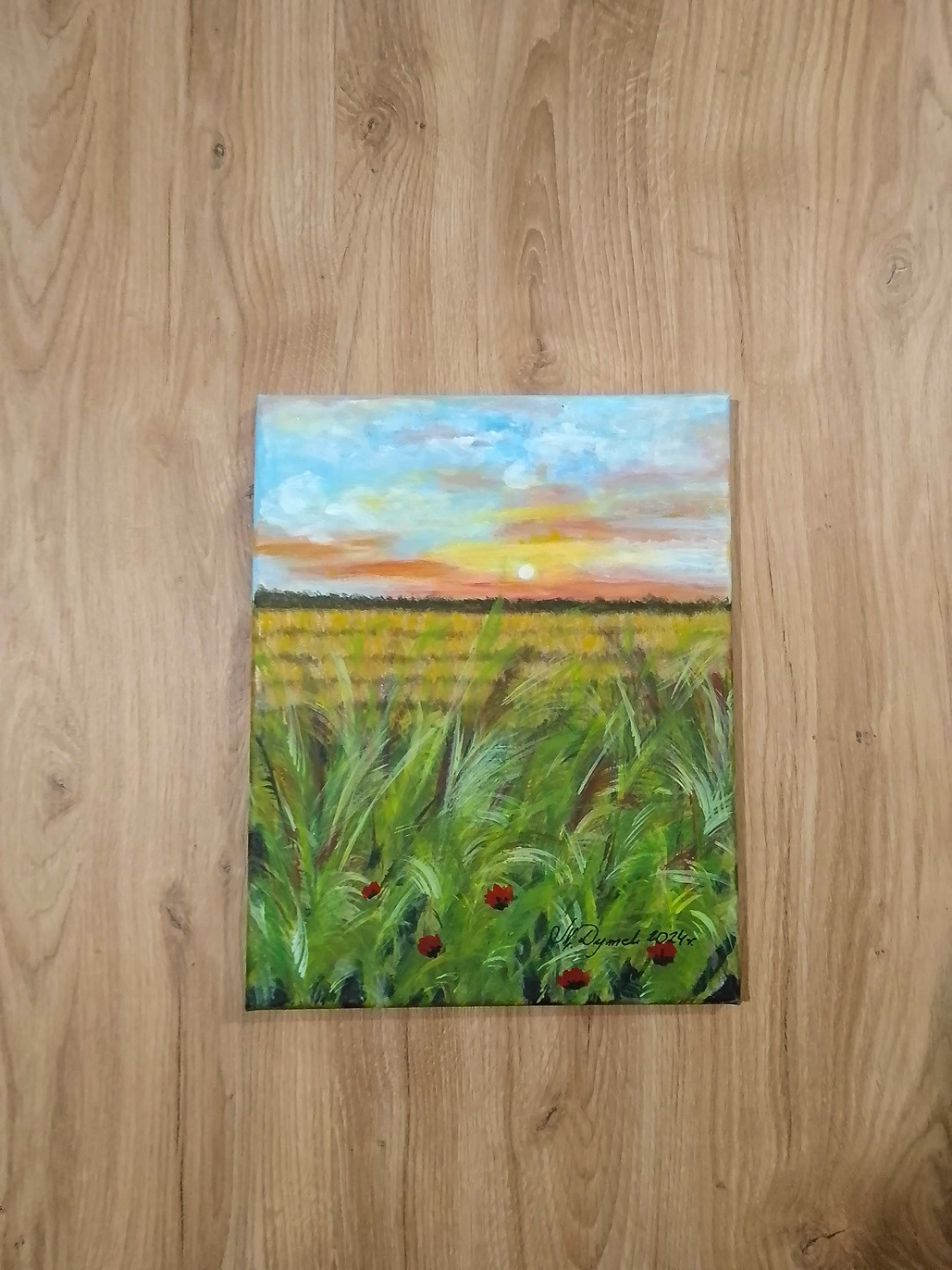 - Tematyka: Sielski widok makowej łąki, zachód słońca, galopujący koń