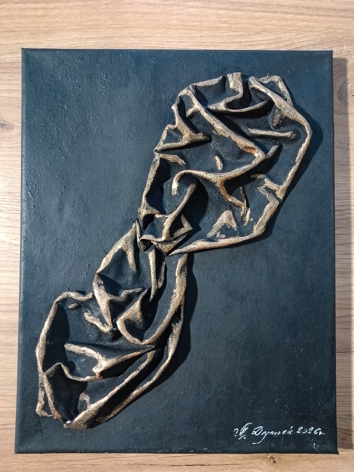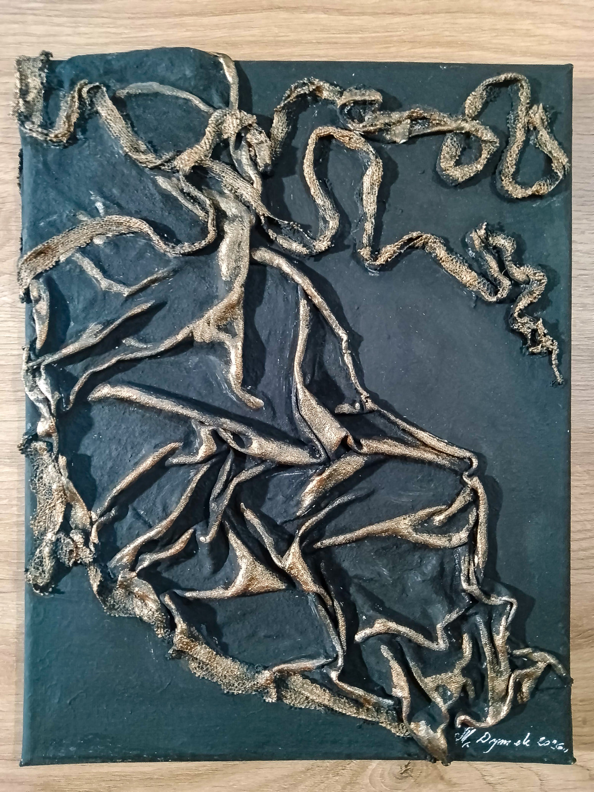 - Technika malarska: Malarstwo strukturalne z teksturą 3D z zastosowaniem modelarskiej pasty strukturalnej oraz farb akrylowych i metalicznych pigmentów