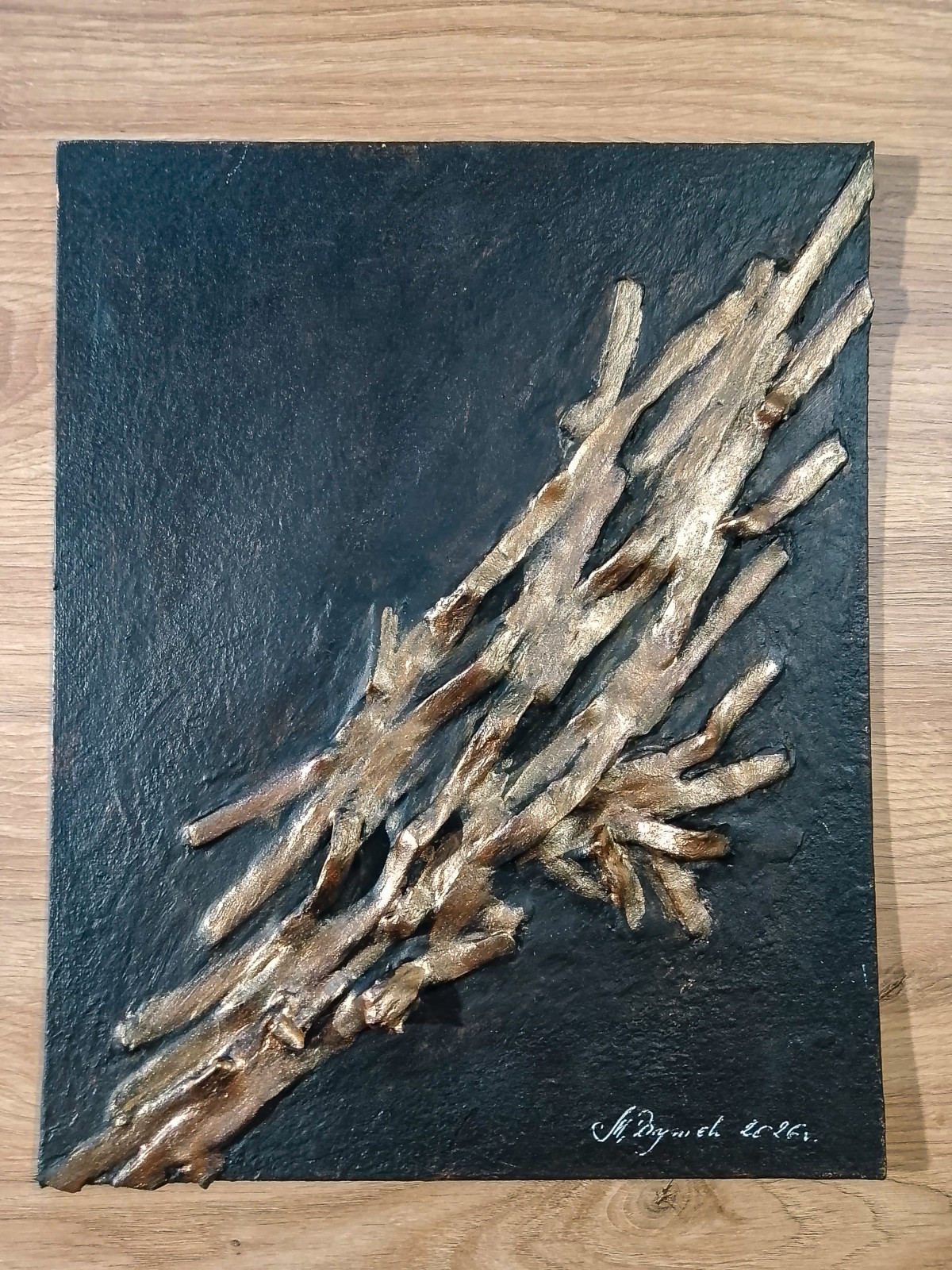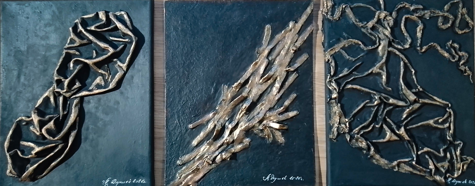- Tematyka: Abstrakcyjna interpretacja motywów leśnych - kory, splątanych gałęzi i korzeni w formie płaskorzeźby. Obrazy emanują spokojem natury ujętym w surową a jednocześnie luksusową formę