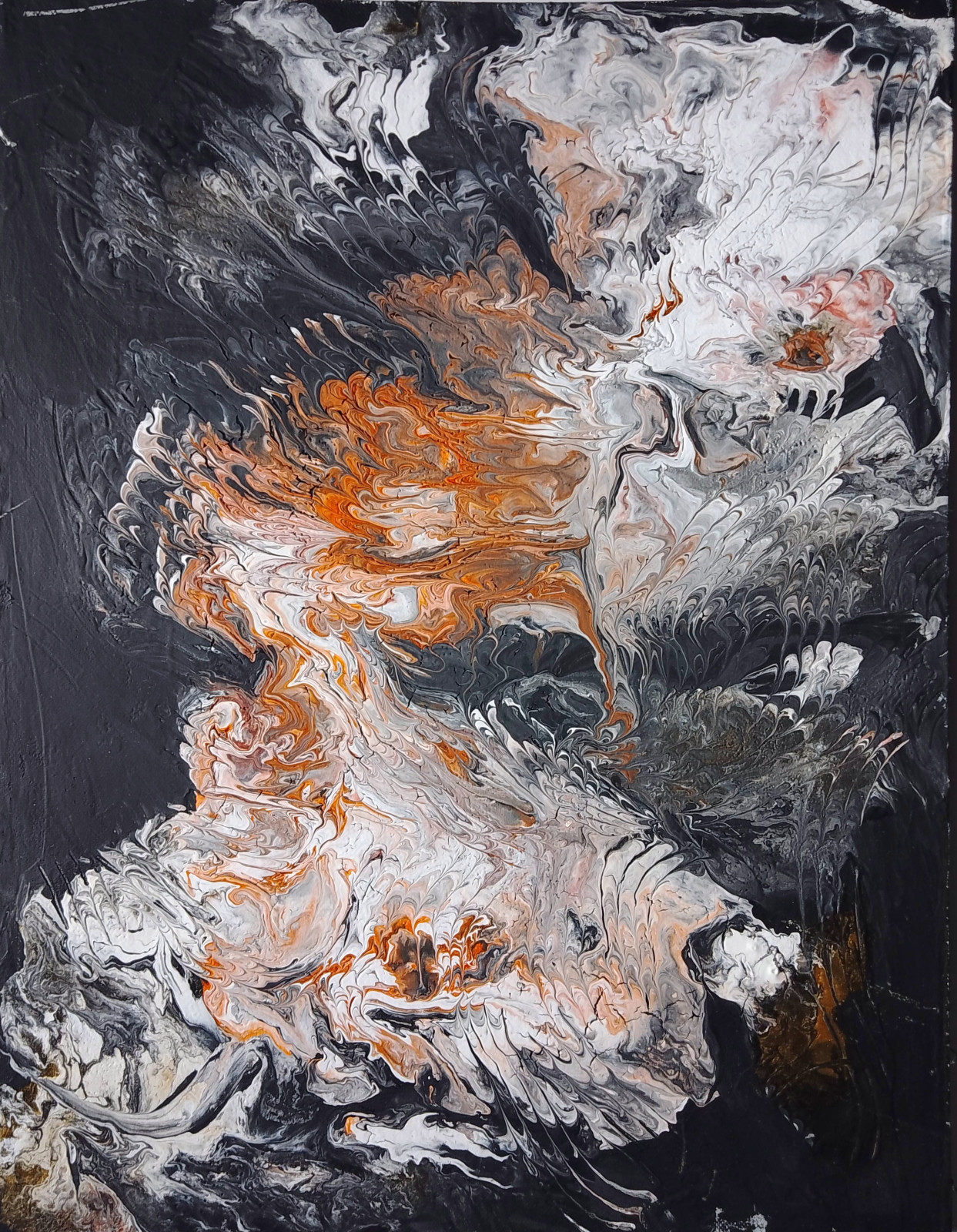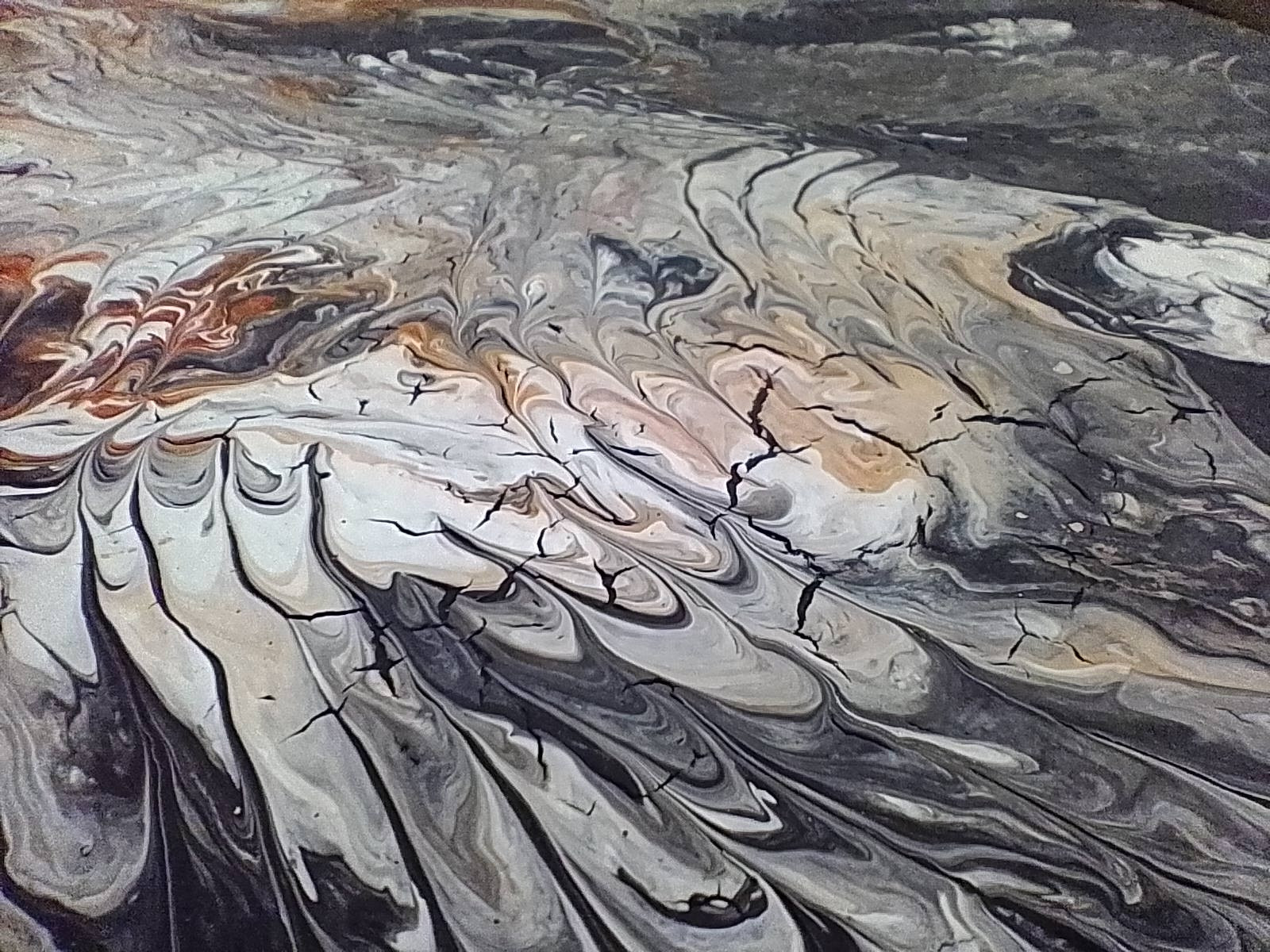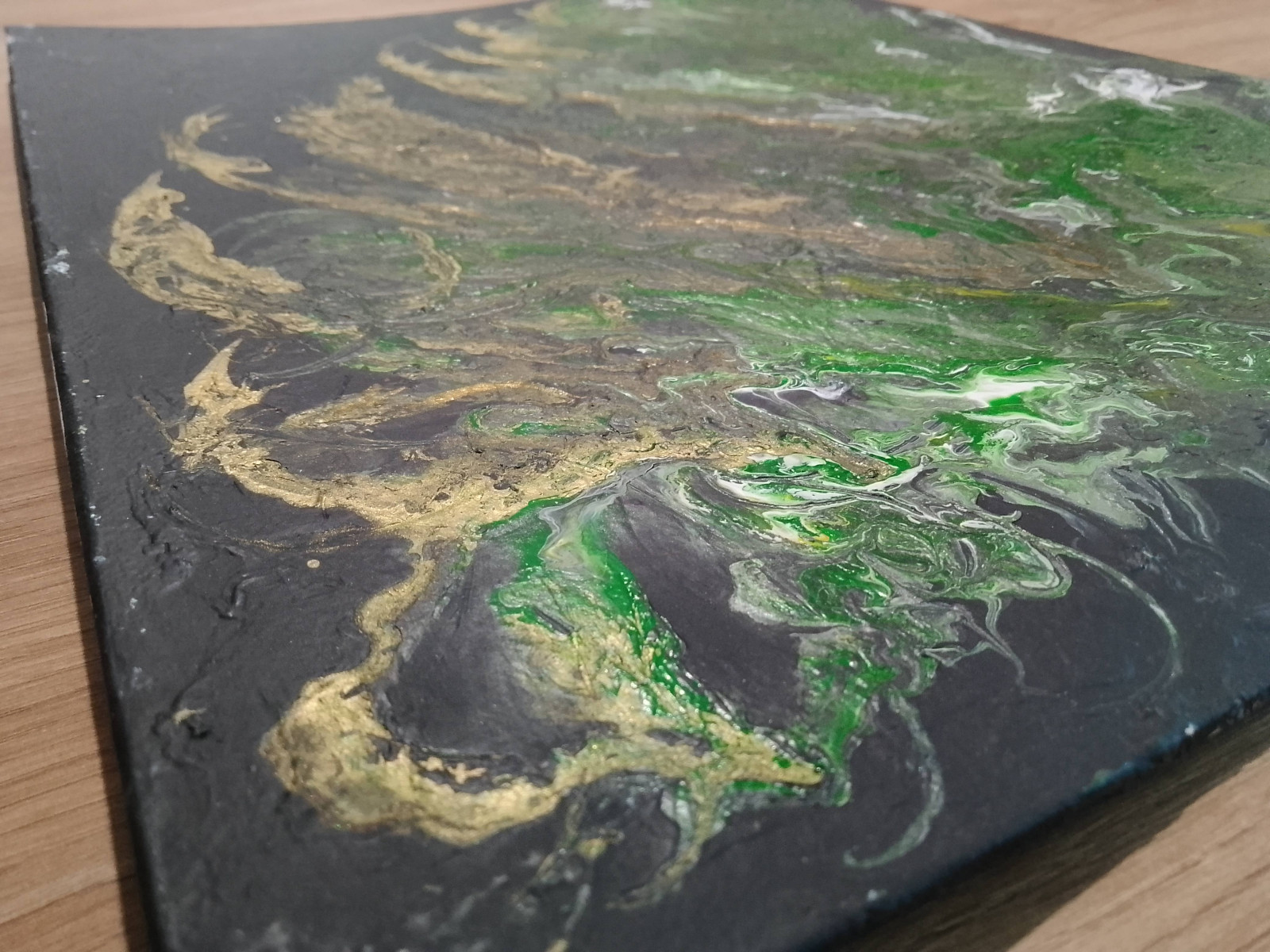 Obrazy wykonane metodą pouring są bardziej sztywne (duża ilość farby zużyta do ich wykonania), miejscami strukturalne (widoczne rzeźby, rysy, pęknięcia), podłoże jest nieco wygięte i poplamione farbą od spodu, ale po włożeniu do ramy się naprostuje a tył nie będzie widoczny. Wszystkie cechy czynią te obrazy bardziej oryginalnymi, niepowtarzalnymi i pozytywnie podkręcają efekt wizualny dekoracji.