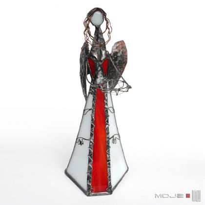Anioł zrobiony jest z czerwonego i białego, gęstego szkła witrażowego, oprawiony witrażową techniką Tiffany z użyciem miedzi i cyny - patynowany i przecierany. Jego główkę zrobiłam metodą fusingu (wypalanie szkła w temp. min. 800 stopni), skrzydła są z miedzianej blachy - również cynowanej i patynowanej. Anioł trzyma koszyczek, do którego można włożyć świeczkę-podgrzewacz i wtedy anioł zamienia się w świecznik...