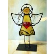 Anioł zrobiony jest z czerwonego i koloru ecru gęstego szkła witrażowego, oprawiony witrażową techniką Tiffany z użyciem miedzi i cyny - patynowany i przecierany. Jego główkę zrobiłam metodą fusingu (wypalanie szkła w temp. min. 800 stopni), skrzydła są z miedzianej blachy - również cynowanej i patynowanej. Podstawka z bezbarwnego szkła.