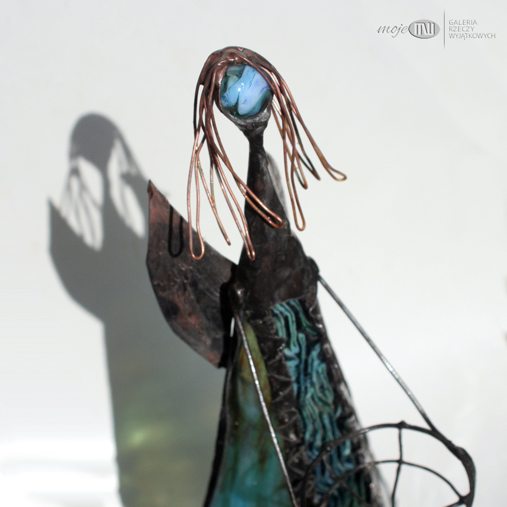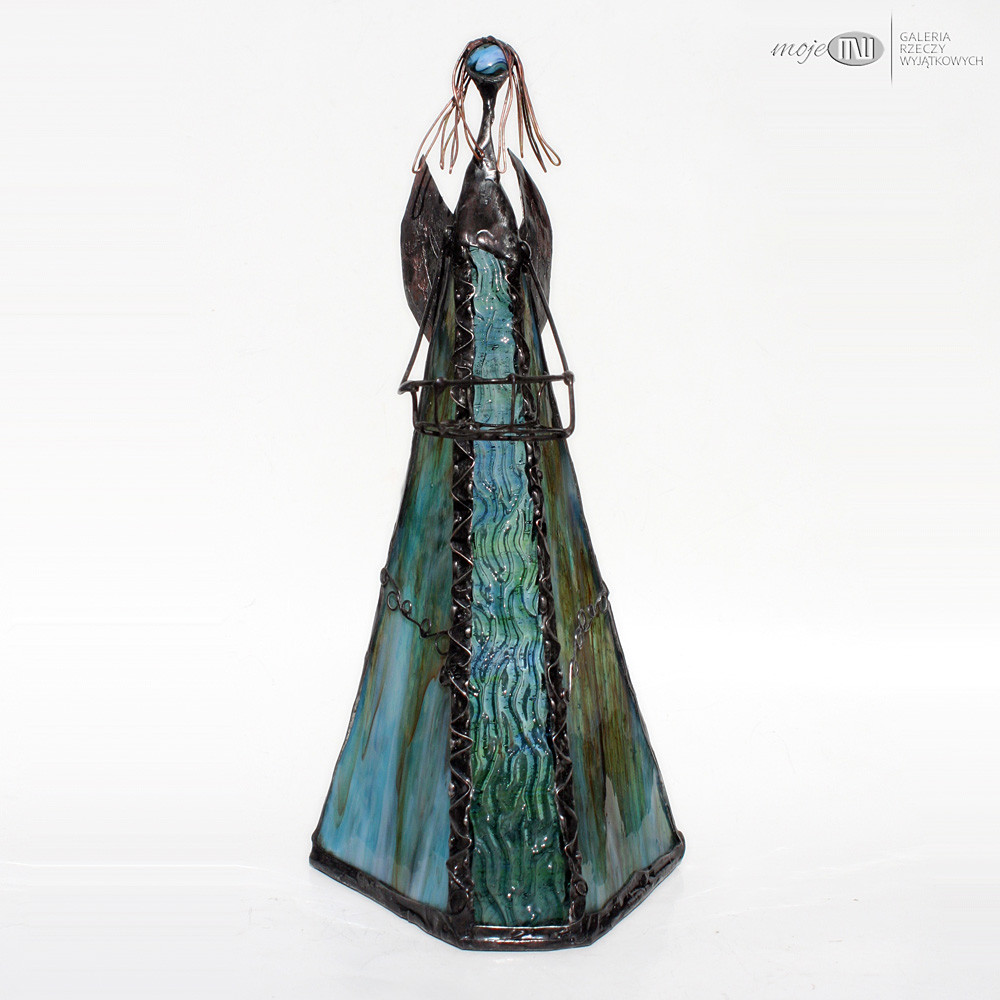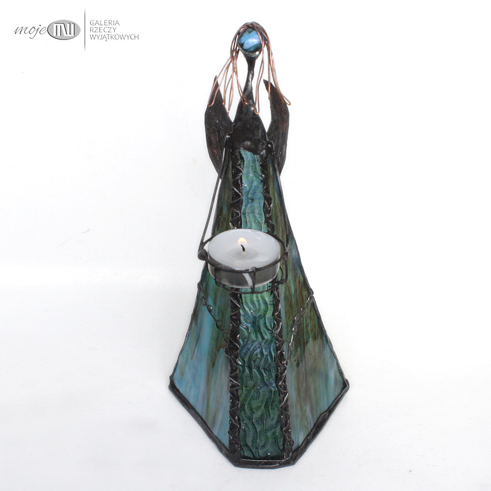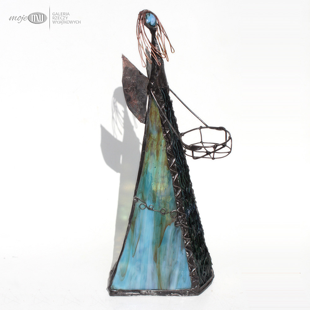 Stojący anioł ze szkła witrażowego w kolorach turkusowo-morskich. Oprawiony witrażową techniką Tiffany z użyciem miedzi i cyny - patynowany. Jego główkę zrobiłam metodą fusingu (wypalanie szkła w temp. min. 800 stopni), skrzydła są z miedzianej blachy - również cynowanej i patynowanej. Anioł trzyma koszyczek, do którego można włożyć świeczkę-podgrzewacz.