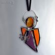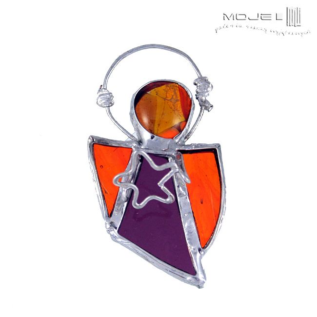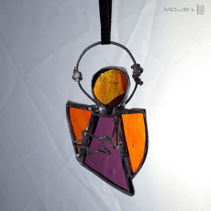 Anioł zrobiony jest ze szkła witrażowego techniką Tiffany, z użyciem miedzi i cyny. Jego główkę zrobiłam metodą fusingu (wypalanie szkła w temp. 800 stopni). Aniołek trzyma gwiazdkę.