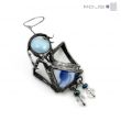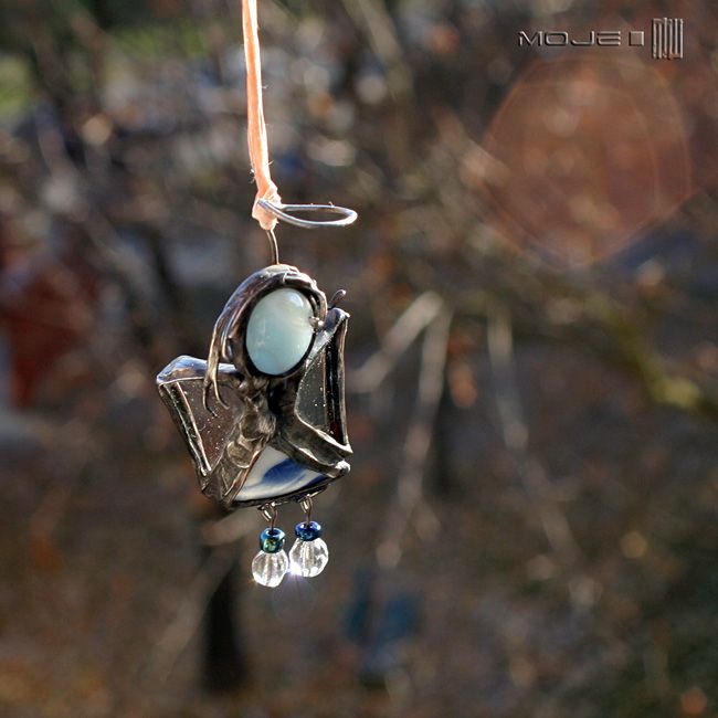 Anioł zrobiony jest z bezbarwnego szkła oraz fragmentu porcelanowej filiżanki, oprawiony witrażową techniką Tiffany z użyciem miedzi i cyny. Jego główkę zrobiłam metodą fusingu (wypalanie szkła w temp. 800 stopni). Dyndające nóżki są z koralików.