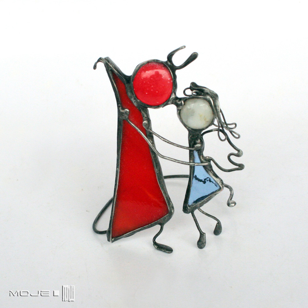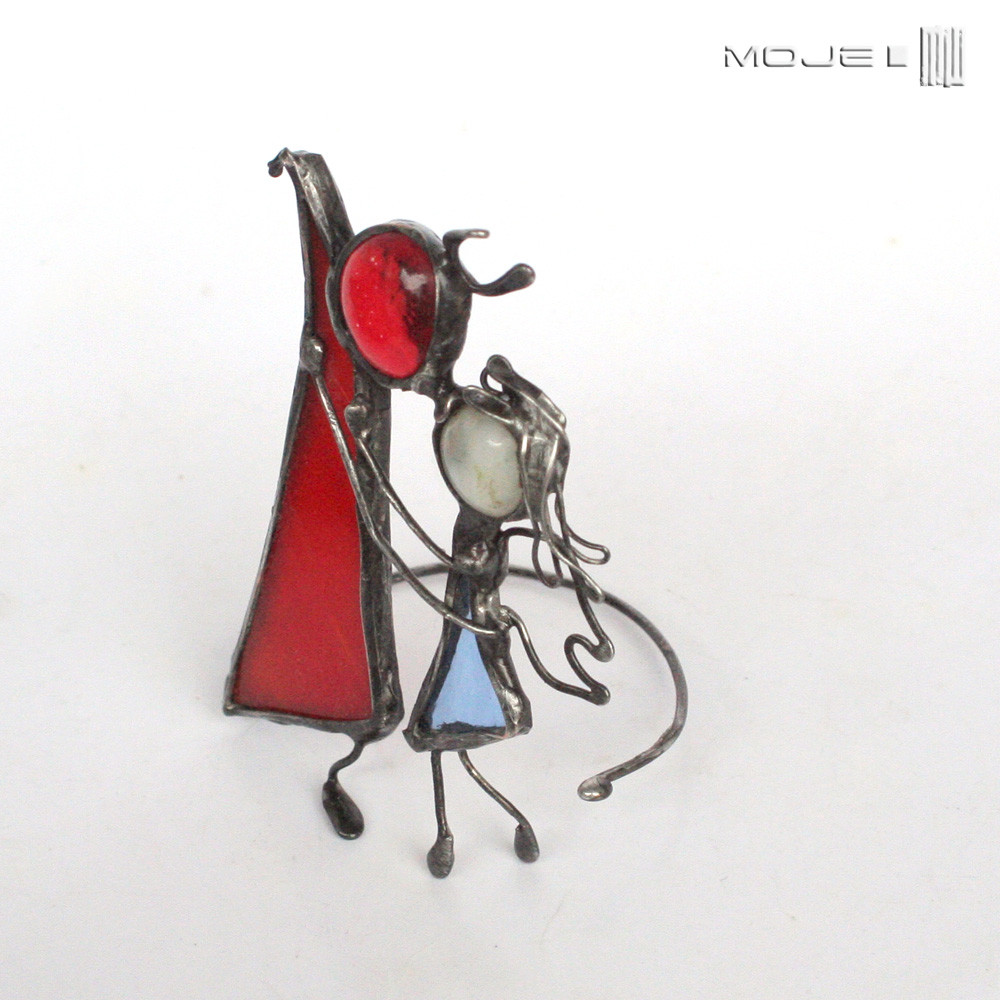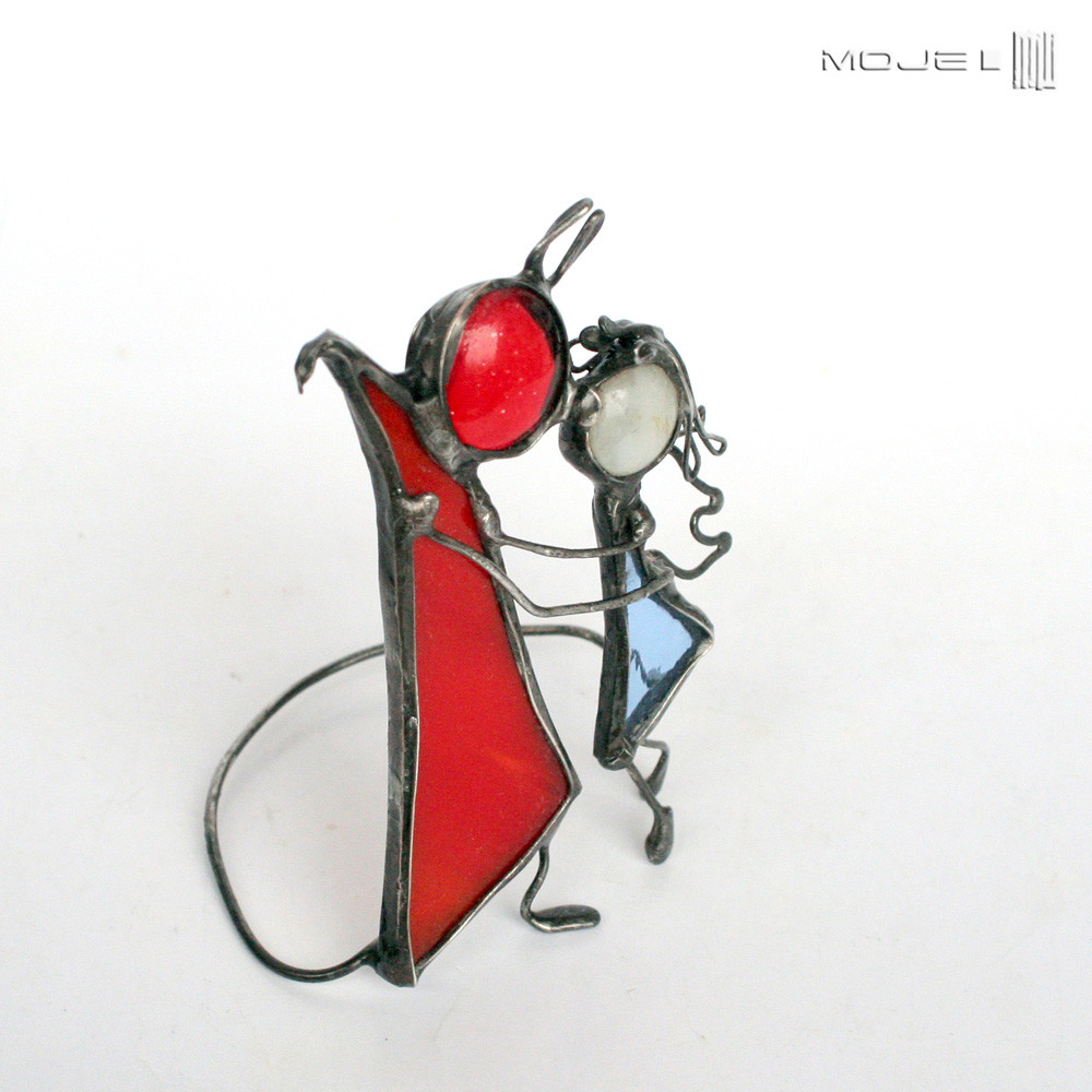 Para - aniołek z diabełkiem z czerwonego i błękitnego szkła witrażowego. Oprawieni i wykończeni są miedzią - pokrytą cyną, patynowaną i przecieraną.
