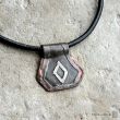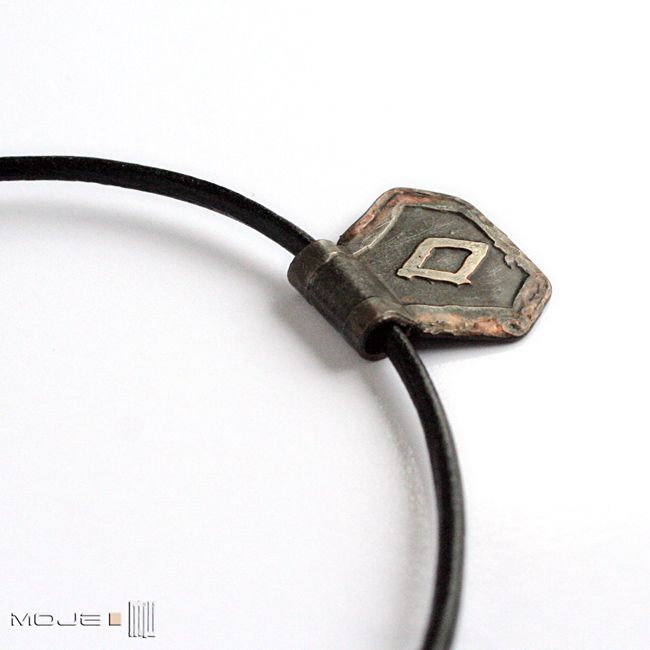 Męski wisior, który zrobiłam z trawionej przeze mnie miedzianej blachy - cynowanej, patynowanej, przecieranej i drapanej oraz czarnego rzemienia (3 mm).