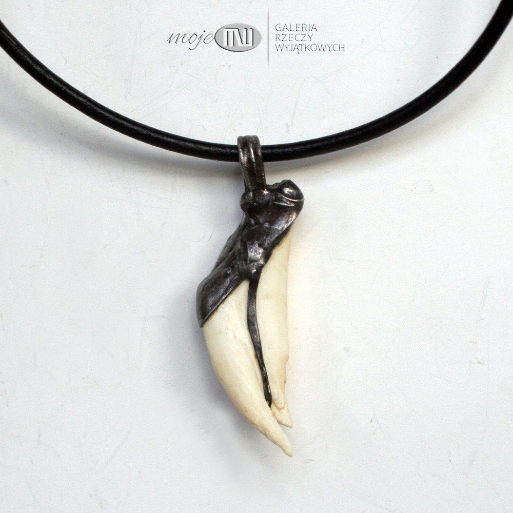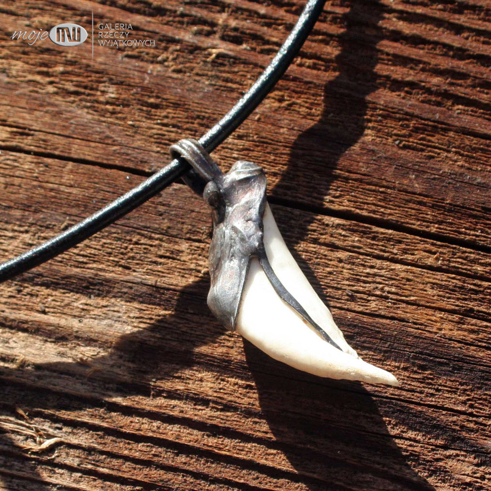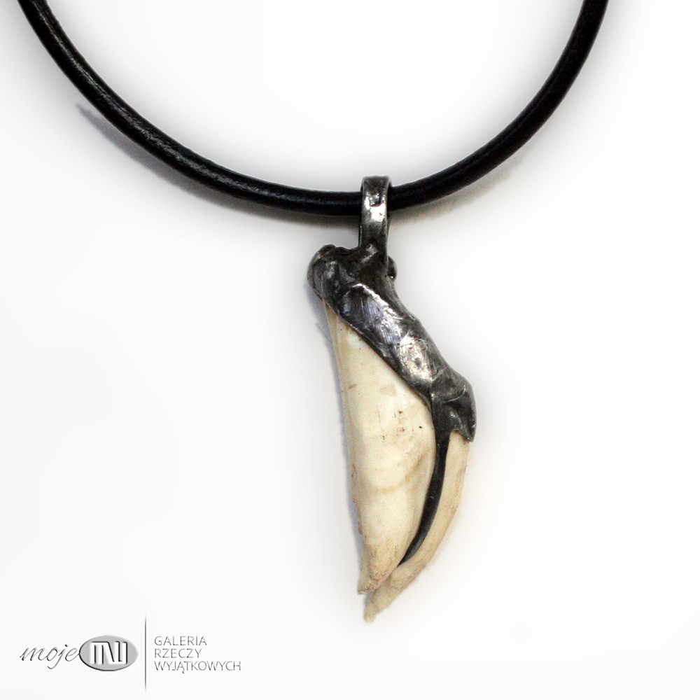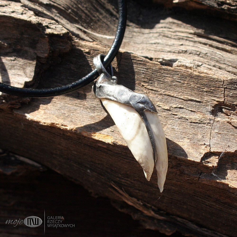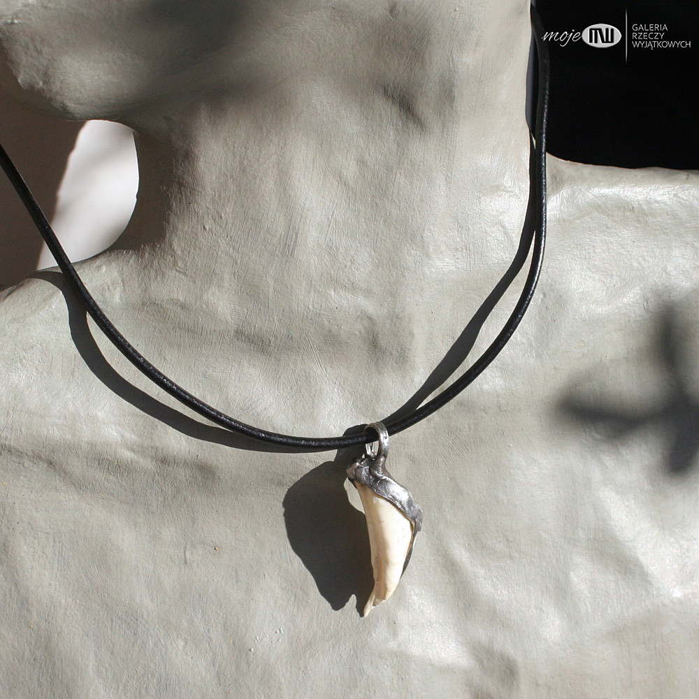 Kieł zawieszony jest na czarnym skórzanym rzemieniu o gr. 3 mm