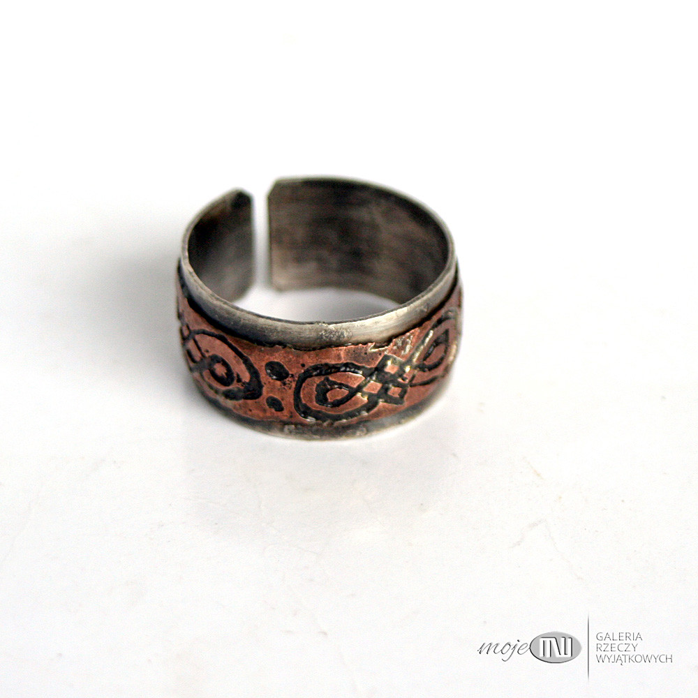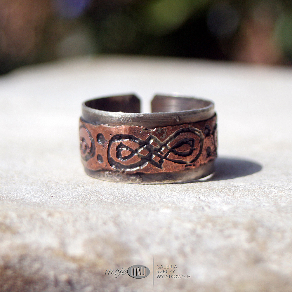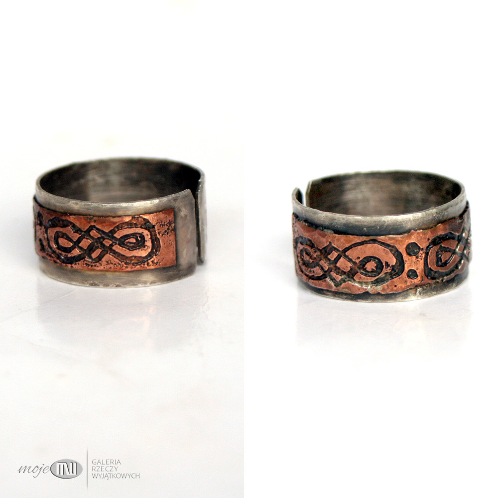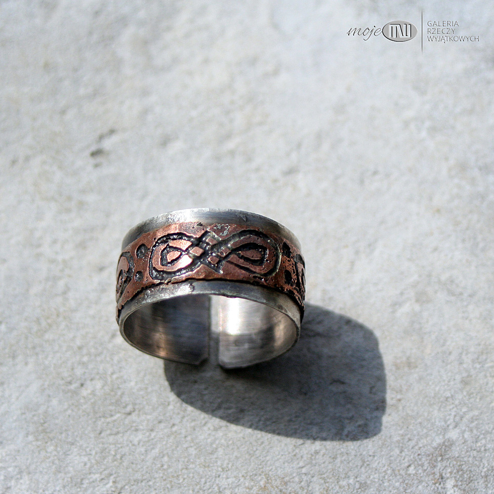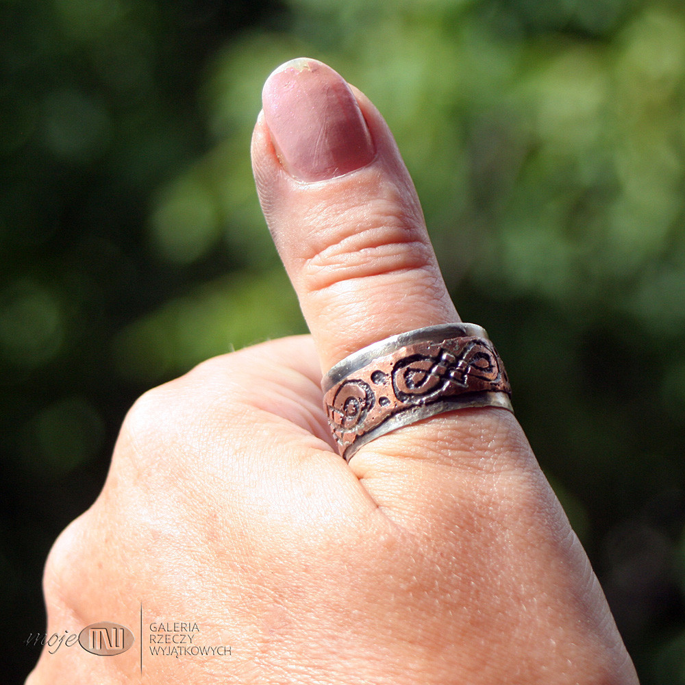 Szeroka męska obrączka z deseniem o motywach celtyckich. Baza obrączki to srebro, a wierzch wykonany jest z miedzi, w której wytrawiłam wzory - potem patynowane i częściowo polerowane dla wydobycia rysunku.