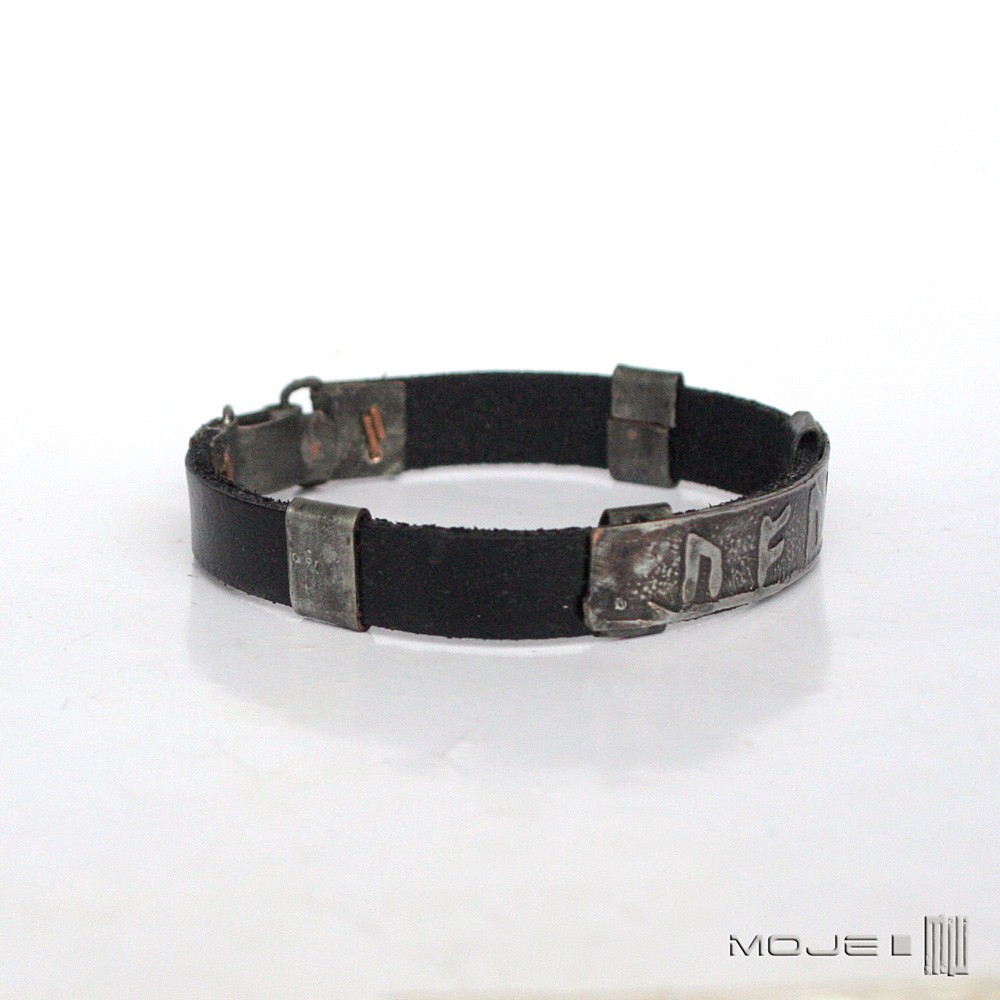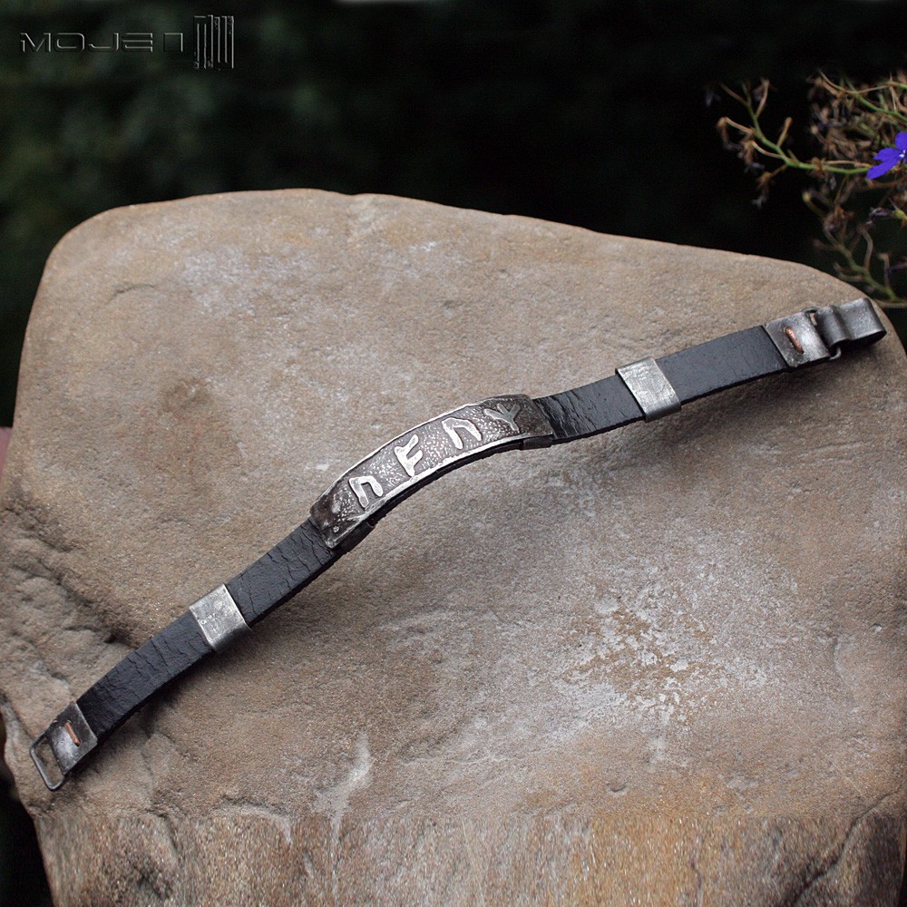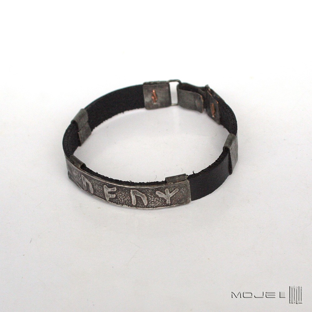 Bransoletka runiczna ze skóry i miedzi. Wybrane znaki runiczne wytrawione są w miedzianej blasze, cynowanej i przecieranej. Skórzany rzemień w kolorze czarnym.