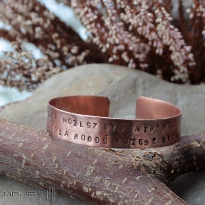 Stemplami wybiłam na niej sentencję z Małego Księcia: Dla całego świata możesz być nikim, dla kogoś możesz być całym światem. Bransoletka nie jest idealnie gładka, co nadaje jej rustykalnego charakteru, jest patynowana i przetarta dla lepszej czytelności napisu.