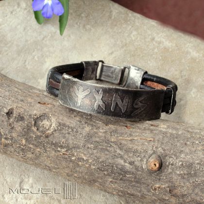 Ochronna runiczna bransoleta. Zrobiłam ją z miedzi - trawionej, cynowanej, patynowanej i przecieranej oraz skórzanych rzemieni w czarnym i brązowym kolorze. Znaki runiczne, odpowiednio zestawione, tworzą amulety wspomagające różne aspekty życia. Te składają się w amulet chroniący od wszelkiego zła.