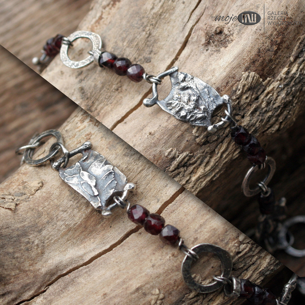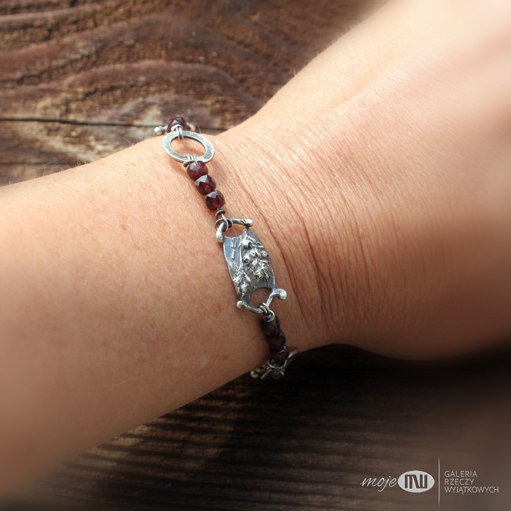 Bransoletka ze srebra i granatów. Realistyczne wizerunki polnych roślinek odwzorowane w srebrze wysokiej próby przedzielają fasetowane granaty.