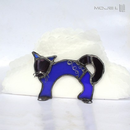 Serwetnik - kot zrobiony ze szkła witrażowego i miedzi techniką Tiffany. Szkło jest w kolorze szafirowym oraz ciemnym śliwkowym. Wykończony jest miedzią - cynowaną, patynowaną i przecieraną.
