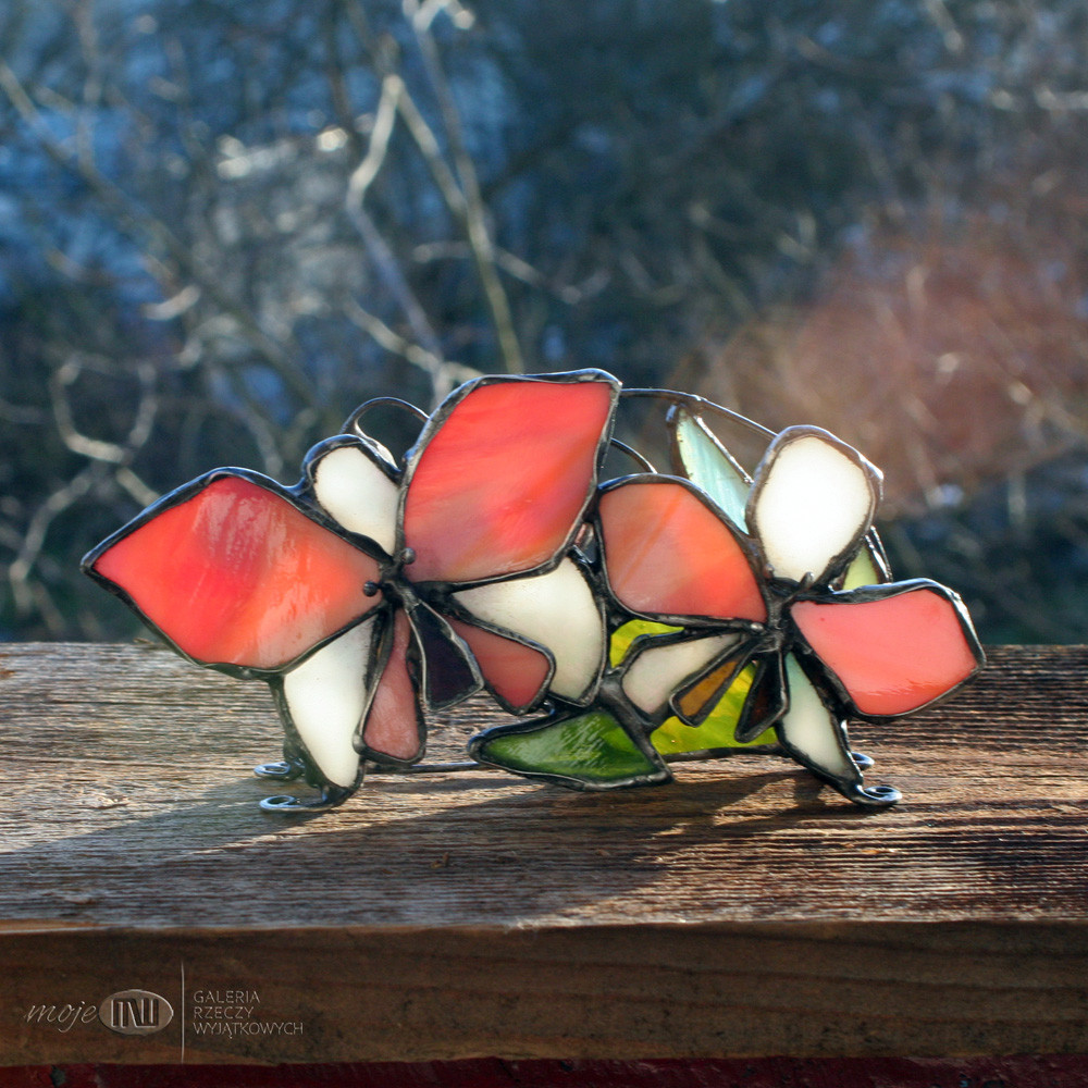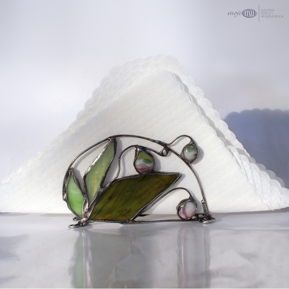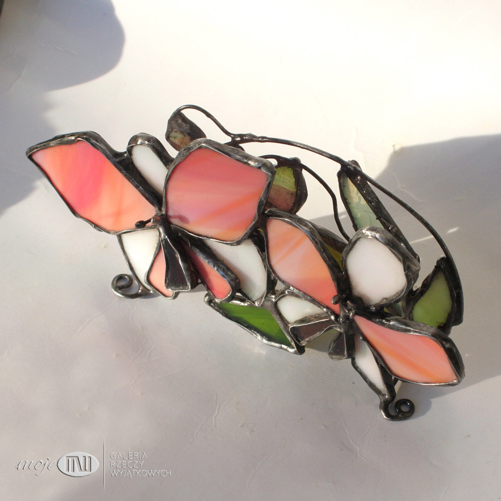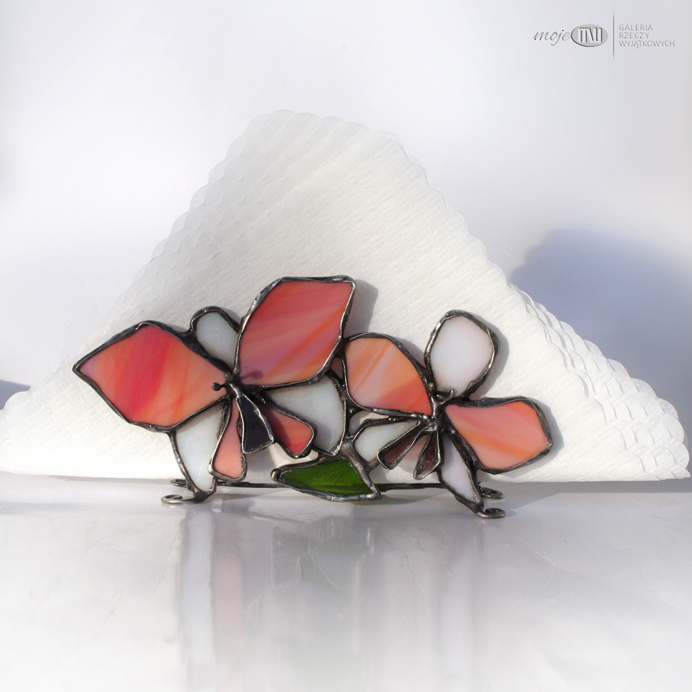 Serwetnik ze szkła witrażowego i miedzi. Szkło w odcieniach pomarańczu, różu, perłowej bieli i zieleni - tworzy z jednej strony wizerunek kwiatów i pąków storczyka, a z drugiej stylizowane pąki i liście. Pączki wytopiłam metodą fusingu. Serwetnik wykończony jest miedzią - cynowaną, patynowaną i przecieraną.