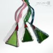 Zrobione ze szkła witrażowego w odcieniach zieleni i czerwieni, wykończone techniką Tiffany za pomocą miedzi - cynowanej, patynowanej i przecieranej. Dodatkową dekoracją są perłowe lub szklane koraliki. Można zawiesić je na prawdziwym świątecznym drzewku, lub wykorzystać jako dodatek do kartki świątecznej lub prezentu.