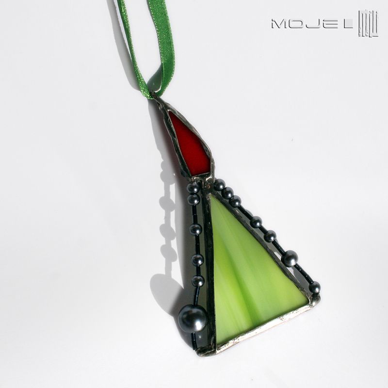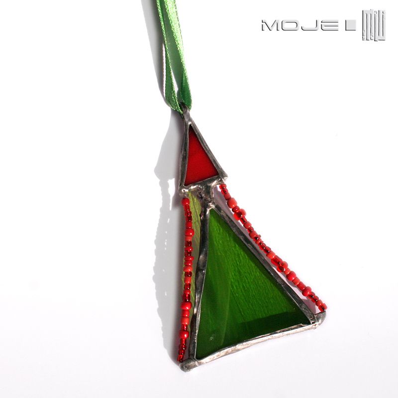 Zrobione ze szkła witrażowego w odcieniach zieleni i czerwieni, wykończone techniką Tiffany za pomocą miedzi - cynowanej, patynowanej i przecieranej. Dodatkową dekoracją są perłowe lub szklane koraliki. Można zawiesić je na prawdziwym świątecznym drzewku, lub wykorzystać jako dodatek do kartki świątecznej lub prezentu.