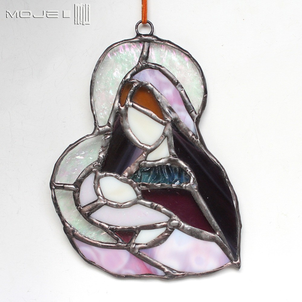 Wizerunek Matki z Dzieciątkiem - ozdobny witrażyk ze szkła witrażowego, utrzymany w odcieniach różu, ciemnego fioletu i kości słoniowej. Patynowany i przecierany. Ma kółeczko do powieszenia na haczyku lub ozdobnej tasiemce.