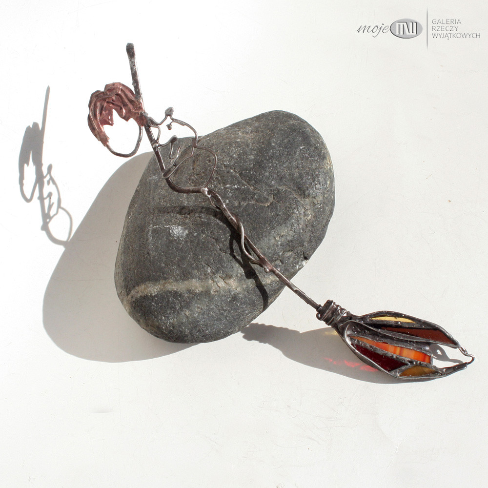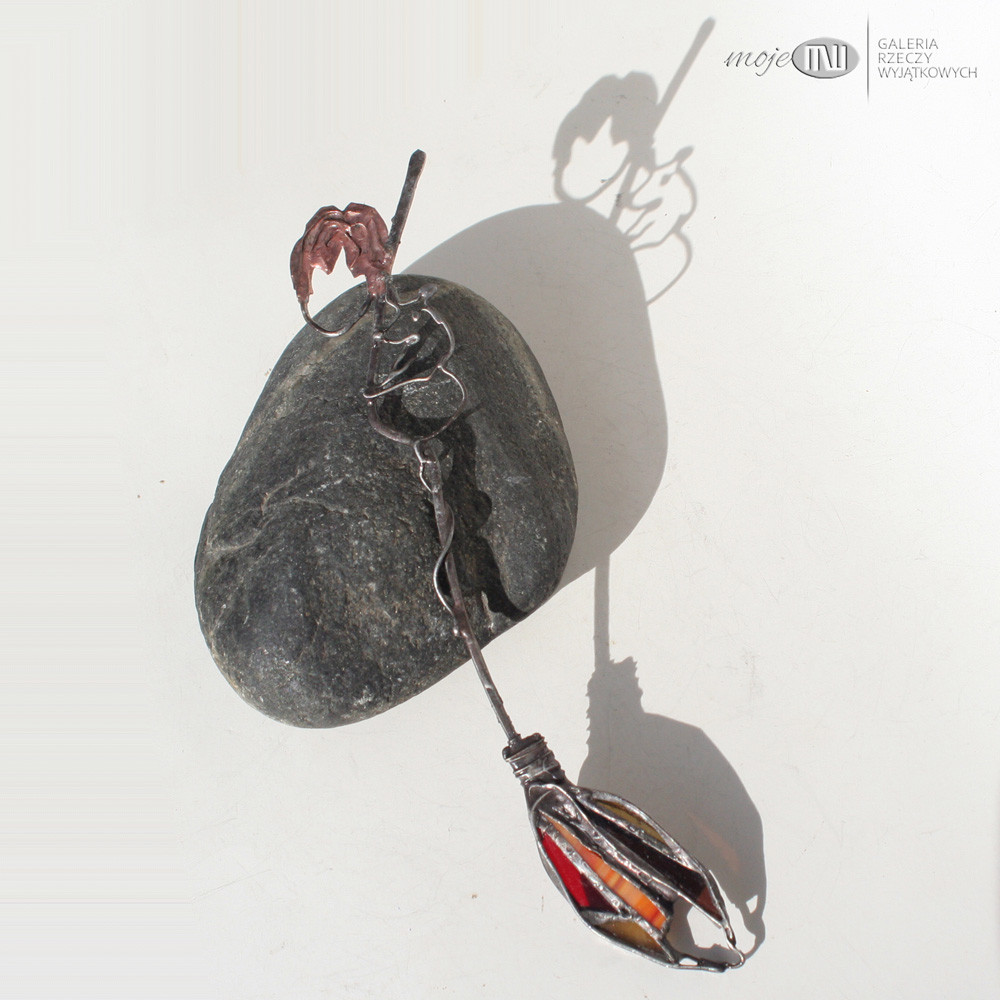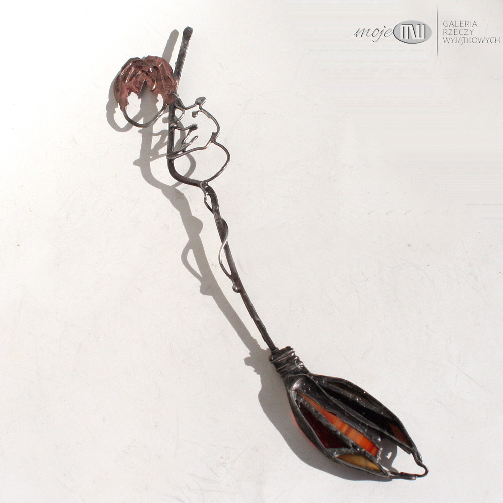 Całość zrobiona jest ze szkła witrażowego oraz miedzianej blachy i drutu pokrytych cyną.