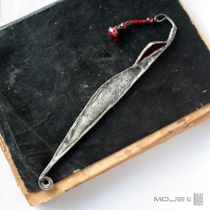 Zrobiłam ją z miedzianej blachy - postarzonej, pokrytej cyną i patynowanej. Ozdabiają ją kawałek bordowego szkiełka i czerwone szklane koraliki.