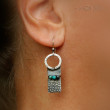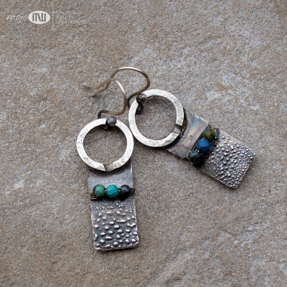 Rustykalne wiszące kolczyki z oksydowanego srebra. Zdobią je fasetowane kulki chryzokoli - kamienia w odcieniach błękitu, turkusu i ziemi. Kolczyki zawieszone są na prostych biglach ze srebrnego drutu.