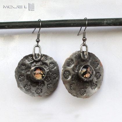 Miedziane okrągłe kolczyki ze szklanym okiem. Szklane kaboszony osadzone są na okrągłej miedzianej blasze z wybitymi kwiatowymi znakami - młotkowanej, cynowanej, patynowanej i przecieranej. Szkło dichroiczne użyte do wytopienia kaboszonów delikatnie połyskuje w słońcu. Blaszka jest cienka, więc kolczyki są lekkie. Metalowe bigle.